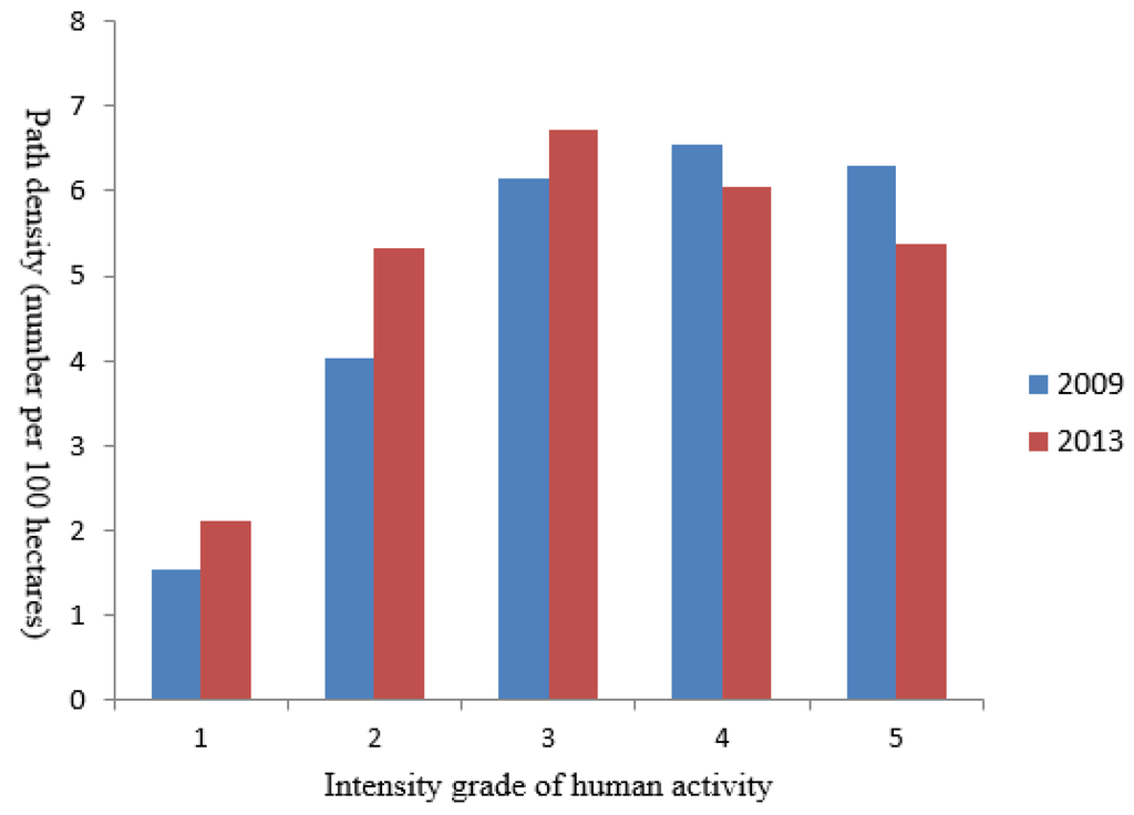 PD is also selected as a metric for further analyzing the relationship between human activity and landscape. Figure 8 shows the change of PD with human activity density. It can be seen that as the intensity of human activity increases from the nature dominant area (Grade 1 area) to the road dominant area and suburban area (Grade 2 and Grade 3 areas), to the city core belt (Grade 4 area), the PD increases as well; in other words, the landscape becomes more and more fragmented, and the degree of fragmentation grows while the activity intensity increases. However, in the city core area whose intensity grade is 5, although the human activity intensity increases, the PD drops down, which is contrary to the overall change trend. It can be inferred that the effect of human activity on landscape within the urban area is influenced by city planning rules or regulations, and the human activity is more regular than that in other areas. In addition, the comparison results of PD between 2009 and 2013 show that the human activity in the non-urban area is becoming more fragmented, while that in the urban area is becoming more regular as time goes by.