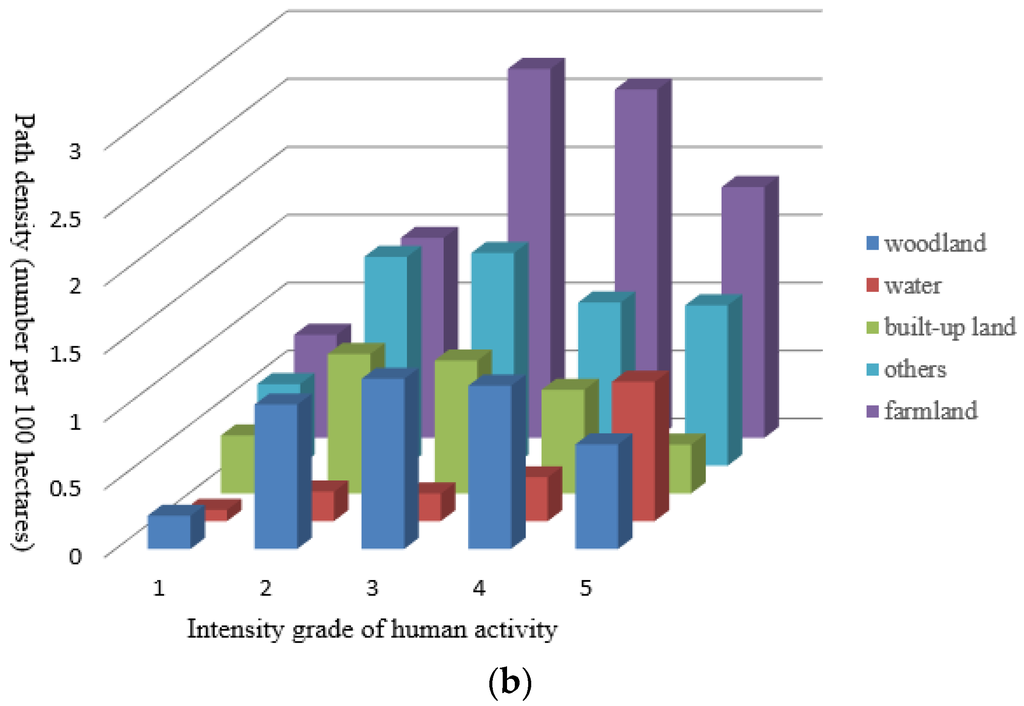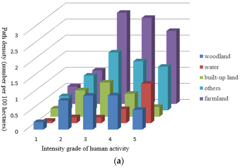 Compared to the landscape-level result, the result at the class level provides an insight into the relationship between human activity and the degree of fragmentation of each land class, as shown in Figure 9. It can be seen that the PD of woodland, water and other land classes (mainly grassland and shrub in the study area) increases with activity intensity. On the contrary, the PD of built-up land and farmland decreases with the growth of activity intensity. The former three land classes are human activity-influenced natural land, while the latter two land classes are man-built land. Therefore, we can infer that overall, human activity causes the natural land to become fragmented while transforming it, but making the man-built land more regular. However, in urban areas, woodland and other land classes are becoming more clustered, which shows a contrary change trend with the overall trend. This further enriches the research results on landscape at a finer scale: human activity generally imposes opposite impacts on natural land and man-built land, but its impacts on natural and man-built land are the same (clustered and regular) within urban areas due to the city and landscape planning regulations.
