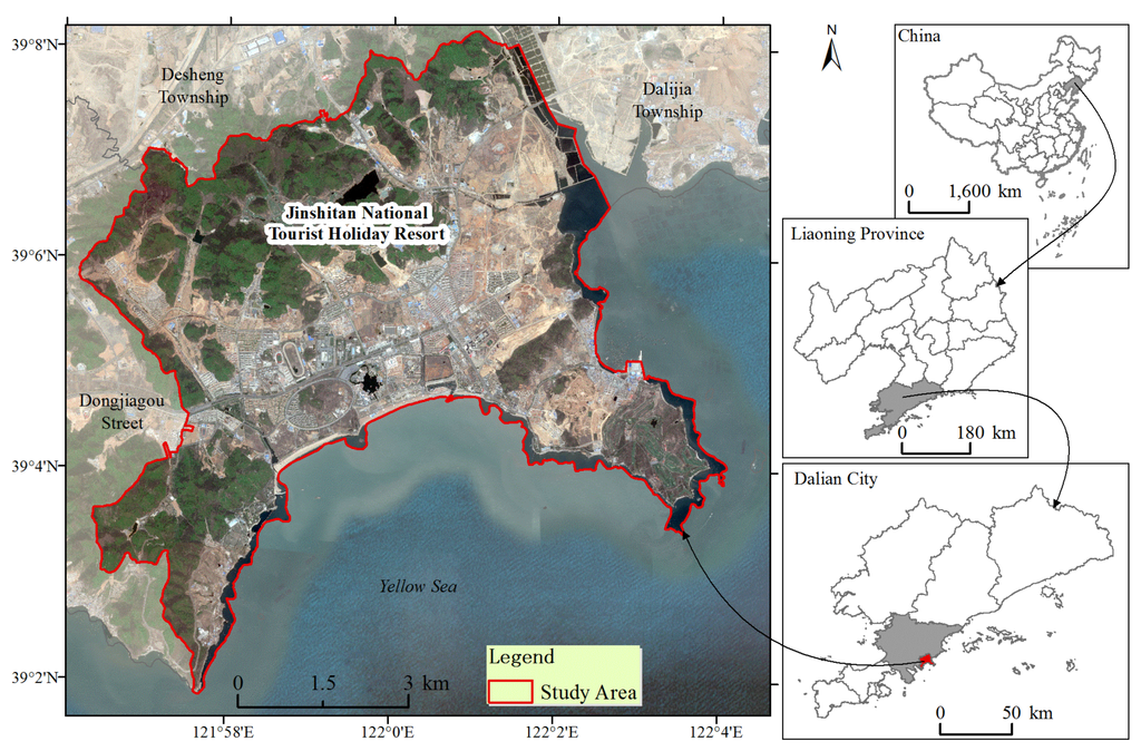 - Fan, Q.; Yang, J.; Wu, N.; Ma, Z. Landscape patterns changes and dynamic simulation of coastal tourism town: A case study of Dalian Jinshitan national tourist holiday resort. Sci. Geogr. Sin. 2013, 33, 1467–1475. [Google Scholar]