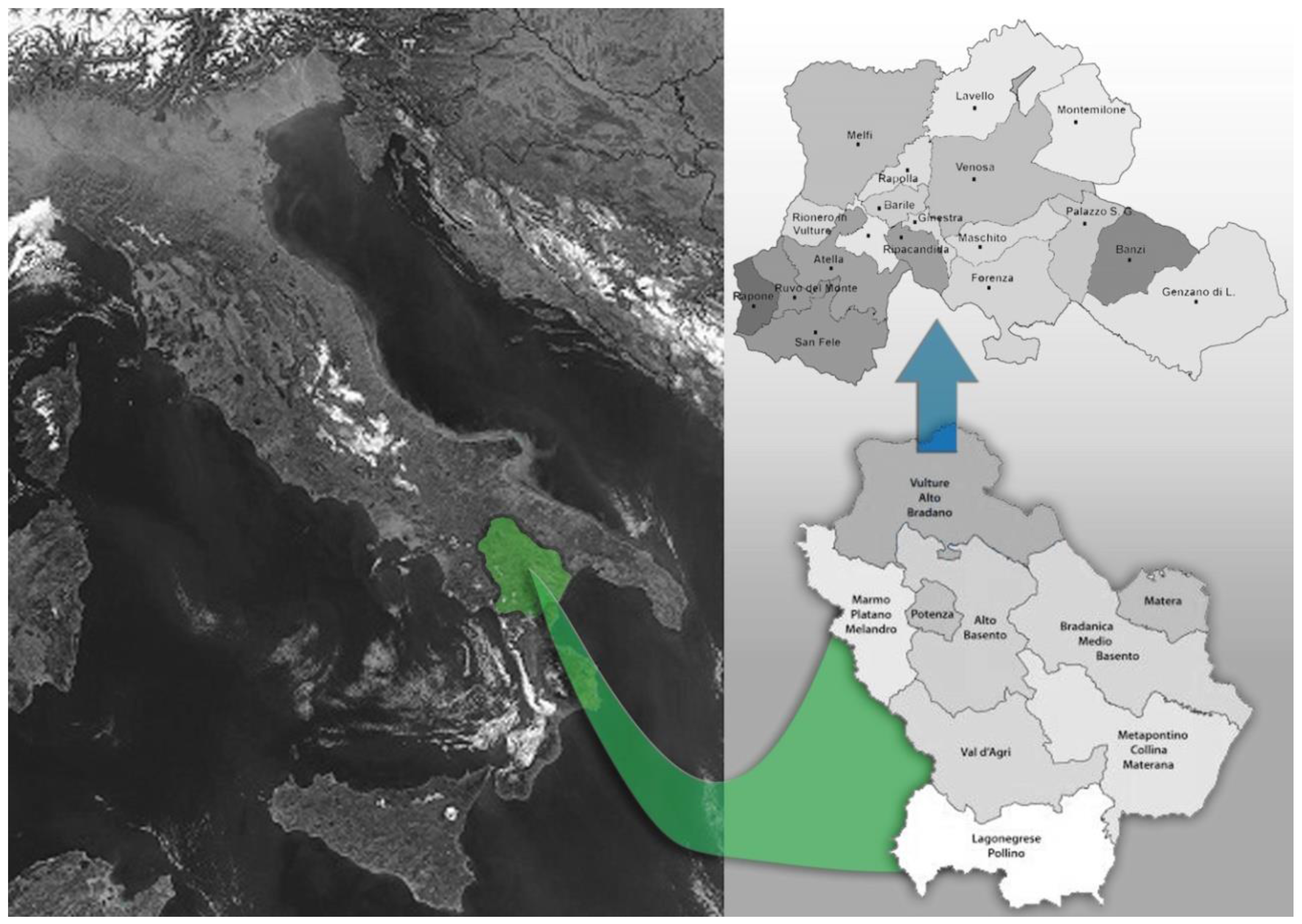The study area, the mountain district of Vulture Alto-Bradano, is located in the northeast of the Basilicata region (Figure 1). It extends between Latitude: 40°59′45″N and 40°49′44″N, Longitude: 15°34′55″E and 16°10′55″E. The name of this area comes from the mountainous area of Vulture Mountain (1326 m), a high ground isolated from the Apennine ridge, which covers about 45,000 hectares.