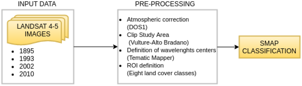 The methodology requires some preventive steps in order to clearly distinguish elements composing the image: atmospheric correction (in the specific case DOS1), the perimeter of the area of interest and the definition of wavelengths’ centers related to the sensor used in remote sensing (in this specific case, the Thematic Mapper). After these preventive steps, it is possible to catalogue land cover classes, defining ROI, and to implement the classification by means of algorithms (in this case, SMAP was used).