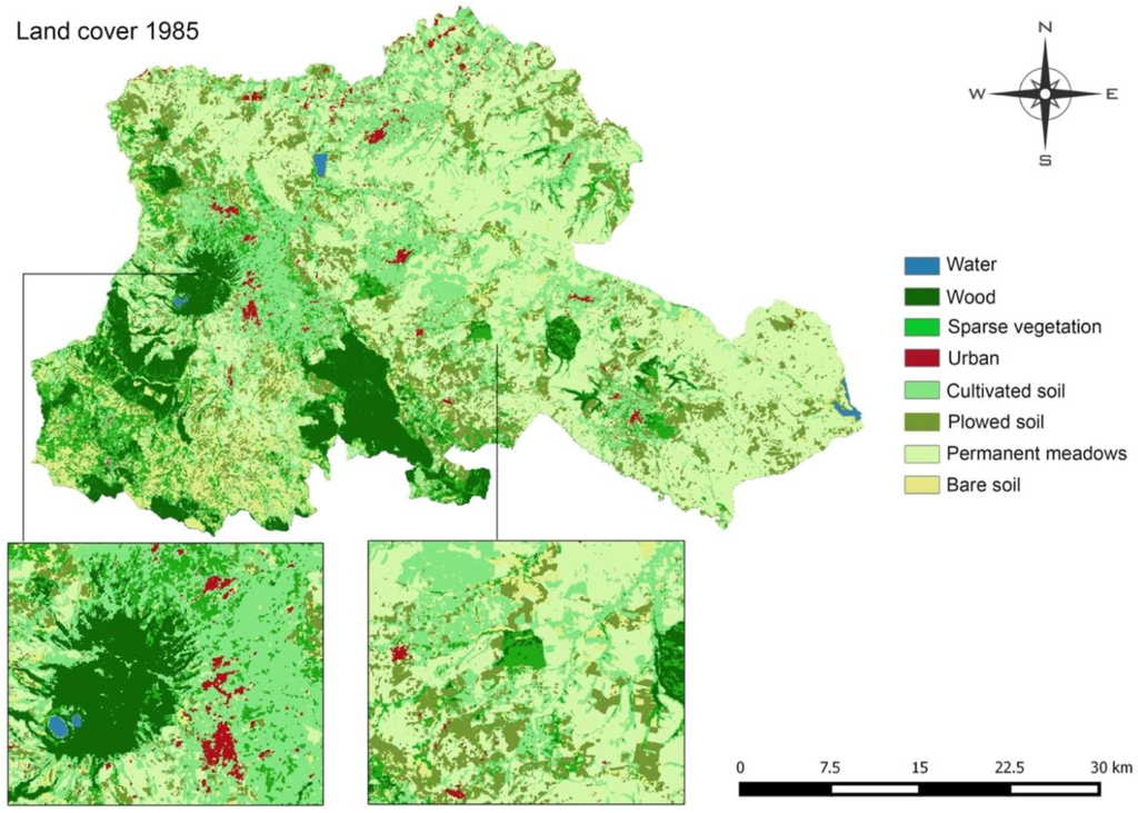 The possibility to implement a historical evaluation for four dates, using Landsat satellite images, allowed estimating that the increase in urban areas from 1985–2010 was approximately 17 km2. Compared to the general trend, this result is lower than the average. However, the mountain district of Vulture Alto-Bradano follows a common trend in Southern Italy; in fact, here, it is possible to observe more than anywhere else that the abandonment of farmlands and small urban centers and at the same time coupled to an increase of the urban sprawl phenomenon [46].