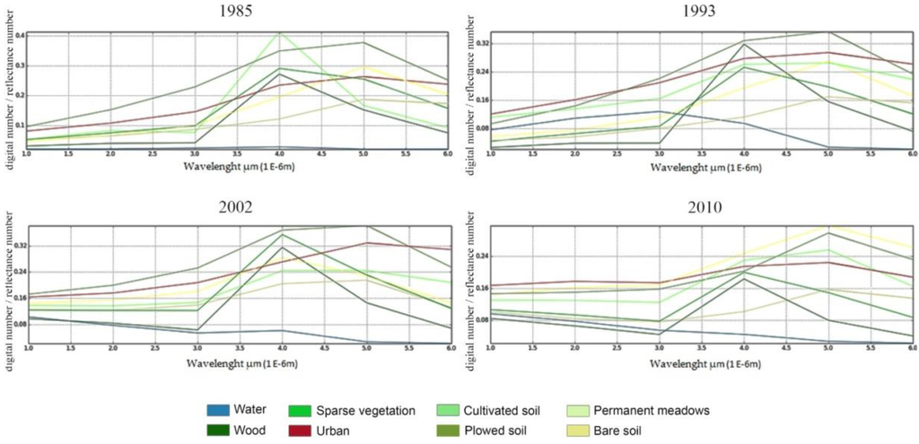 Compared to such values and to the proportion of correctly-classified objects over the total amount, among all classifications, the average percentage value of incorrectly-calculated objects was around 9%. A single peak was detected in classification for 1993, where about 13% of items were not correctly classified. In general, percentages describing total classification accuracy never dropped below 80%, thus allowing asserting the trustworthiness of statements, considering errors arising from the presence of objects with very similar spectral signatures (urban and bare soil, urban and plowed soils) and from the minimum percentage of relegated objects in classes different from those in which they were placed.