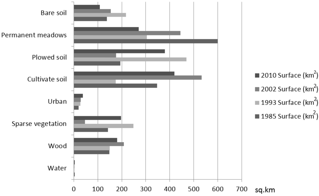 On these surfaces, an increase in vegetated areas corresponds to a decrease in water surfaces. In other words, these variations in terms of land cover changes are correlated and do not represent sampling errors, as also supported by reliability levels in both classes. The migration of objects belonging to the sparse vegetation class to cultivated soil and vice versa highlights a noticeable increase of cultivated soils in 2002, with occupied areas equal to 533.07 km2. This could be explained in two different ways: on the one hand, it describes the actual possibility that sparsely-vegetated soils are converted into productive soils; on the other hand, it takes into account the possibility that these variations may be the result of misclassification due to very similar spectral signatures. Observing the comparison between the extent of both classes in 1985 and 2010 and their transition matrix (Table 5), it is possible to confirm that approximately 17 km2 of land area have been urbanized and that there was an increase of 1% in agricultural and permanent meadow soils (Figure 7).