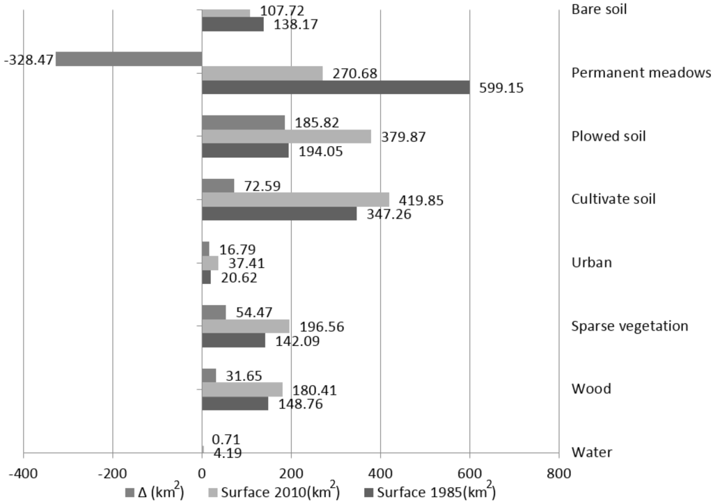 The assessment of changes occurred in the area between 1985 and 2010, compared to the identified land cover, has highlighted how, in 25 years, urban areas have increased at the expense of agricultural land, rather than bare soil. This datum was already visible observing surfaces (km2) and soil coverage changes in terms of percentages measured for the considered date (Table 4): these variations were most appreciable in a graph (Figure 6).