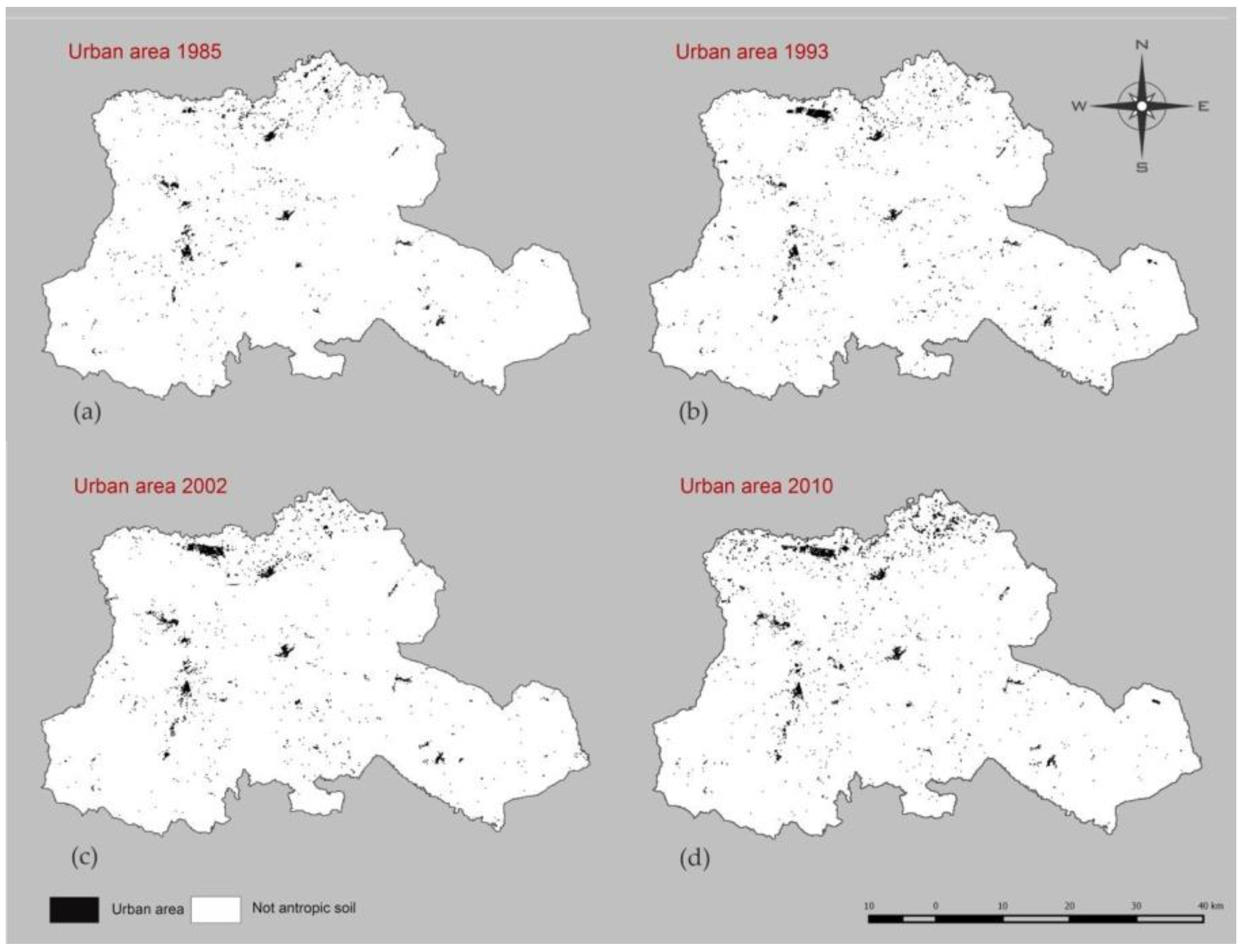 (a–d)Evolution of urbanized areas in 1985, 1993, 2002 and 2010, respectively.