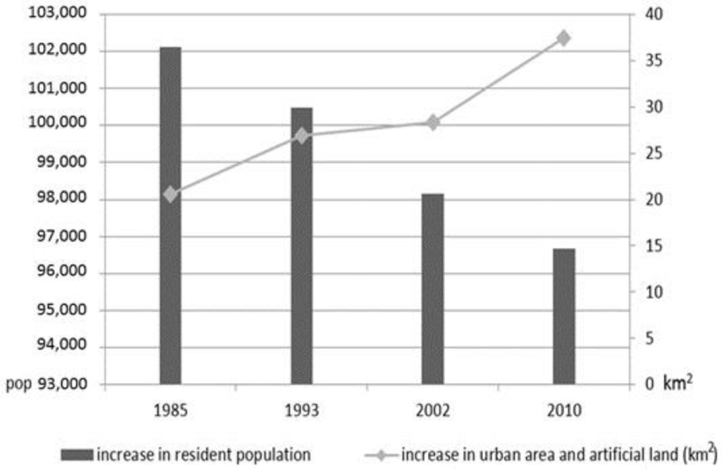 Comparison of the increase in population and the increase in urbanized areas between 1985 and 2010; elaboration on the data from the Italian National Institute of Statistics.