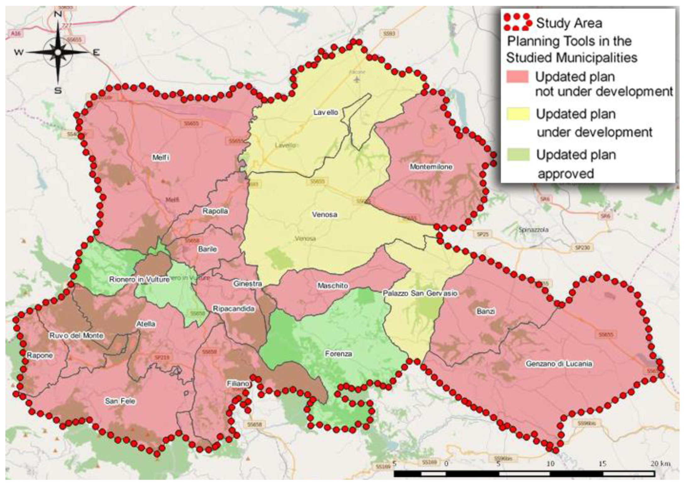 The case of Vulture-Alto Bradano also highlights an issue that is often recurrent in Italian scenarios. Urban planning tools, obsolete or outdated, indeed, usually drive the growth of urban areas. In the Basilicata region, the Law on Urban Planning 1999/23 required the renewal of all municipal planning tools of the region. However, in Vulture-Alto Bradano, only two municipalities have taken steps to upgrade their plans (Figure 11), to date, while in the remaining municipalities, urban development still takes place in accordance with the instruments adopted in the 1980s and, therefore, no longer useful to answer to the changed social and citizenship needs.
