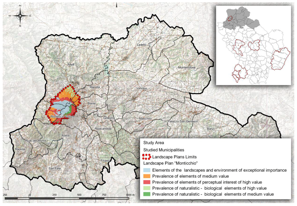 Similarly, the protection of agricultural and natural landscapes in the Basilicata region is entrusted to landscape plans. These, however, do not study the entire region, but only some of its portions (Figure 12). Specifically, only the area of Mount Vulture and Monticchio volcanic lakes has specific landscape protection rules inside the study area.