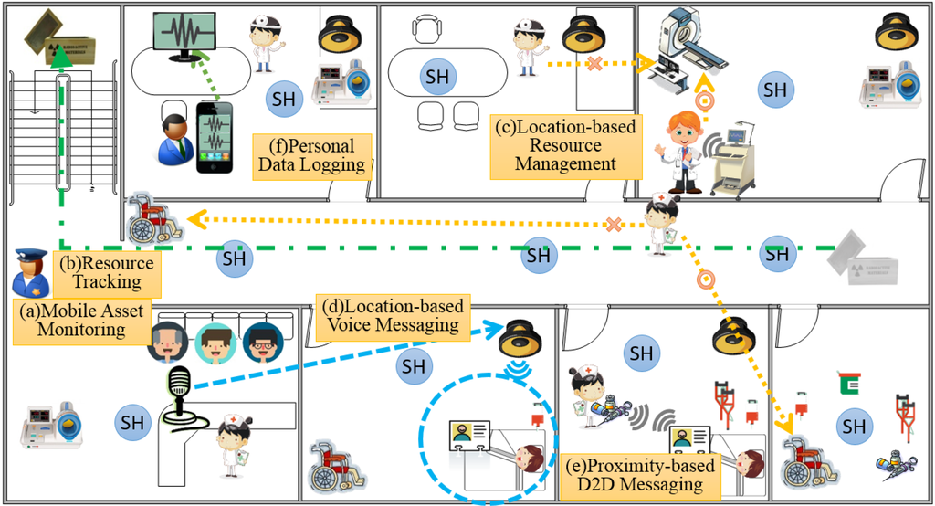 Figure 1 is a representation of a location-based IoT service scenario in a hospital environment. A hospital has numerous mobile assets, such as wheelchairs, chemicals, medicine, and hazardous waste materials. The administrator will request typical IoT services, such as (a) monitoring the location and status of equipment; and (b) checking the path of hazardous materials to confirm their safety (shown as green line). In addition, a nurse can request location-based services, such as (c) finding or reserving an available wheelchair near her current position; (d) broadcasting only to the position of the patient who called rather than broadcasting to the entire hospital; or (e) checking the proper medicine by proximity-based direct Device to Device (D2D) communication with a patient’s wearable device. Lastly, (f) a user uses the private data such as daily activity or vital signal stored in personal storage.