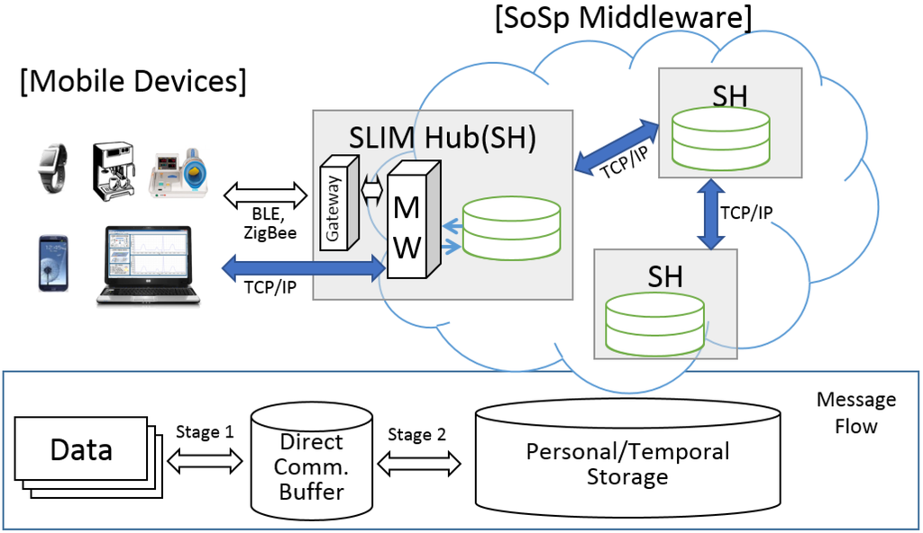 - Stage 2: Message oriented middleware↔ SoSp messaging middlewareAfter that, the message is transferred to the SLIM Hub (SH), and stored in local storage inside the SH. The stored message will be delivered to personal storage via a preset path, or stored in temporary storage until the SH finds the destination using a location-based neighbor-searching protocol.