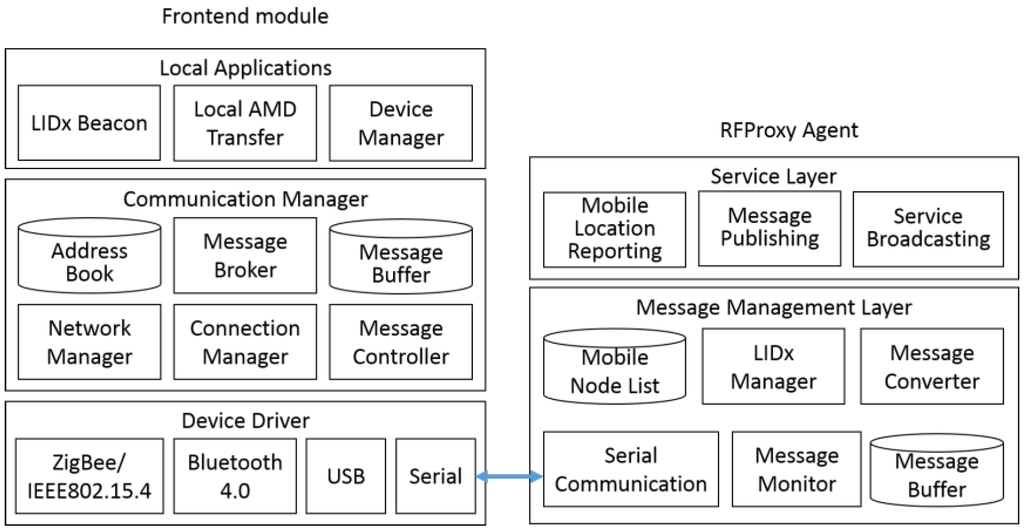 Figure 3 shows the elements of the frontend module and the RFProxy agent. The FE supports a variety of wireless-communication protocols using a communication manager. The address book converts an address from a communication address (like a MAC address) to an identification address (like a unique user ID), or reversely. It helps that we can communicate with a mobile device using a unique ID without concerns about the real communication protocol. The network manager and connection manager manage the specific protocol depending on the characteristics of the communication protocol. Particularly, the connection manager manages connect-based protocols, such as Bluetooth, allowing them to communicate with a number of mobile nodes by repeatedly connecting and disconnecting as necessary. The message controller divides a message into a size suitable for the communication protocol and combines the divided message into a single service message once it arrives.