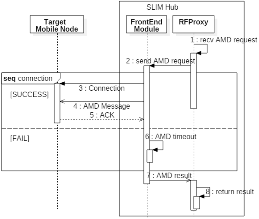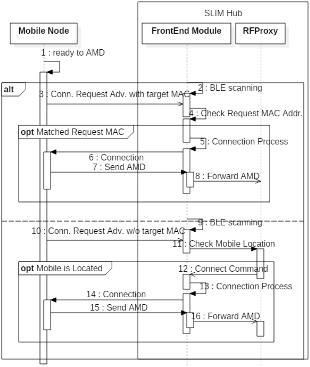 Figure 4 shows how the frontend module sends a message to the mobile node. If the FE receives a message request (1, 2), it switches the Bluetooth mode to a central mode, which can create a connection. When it is connected to the mobile node (3), the FE transmits the message and saves the results (4, 5). Next, the FE forwards the result to RFProxy (7, 8). If the transmission fails because the mobile node has moved, the message is re-transmitted by a location-based protocol, so the message is transferred regardless of the mobile node’s movement.