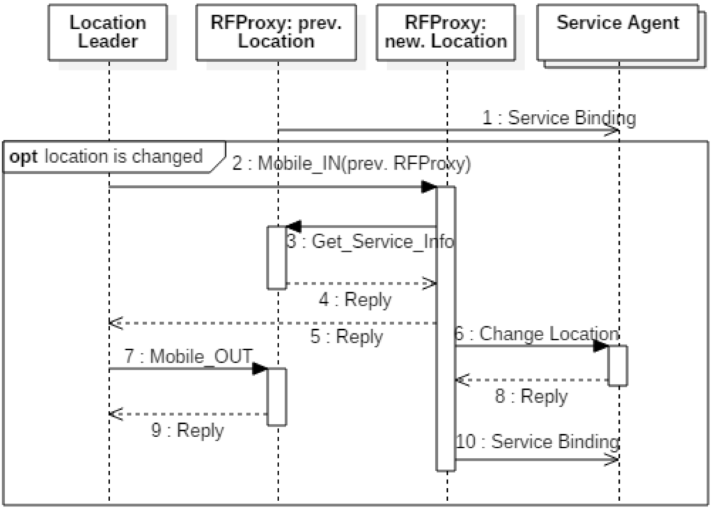 Figure 6 is a sequence diagram showing how the service agent and mobile node reconnect when the mobile node changes location. First, the mobile node binds with various service agents in its previous location. Here, “bind” refers to the path for asynchronous message delivery, not the connection binding for synchronous messaging. When the mobile node moves to the new location, the location leader informs the new RFProxy of the movement of the mobile node, with information on the previous RFProxy (2). The new RFProxy receives the service information associated with the mobile node from the previous RFProxy (3, 4), and requests a re-binding to the service agents (6, 8). Now, the service agents and the mobile node can communicate through the RFProxy (10). By running this process as a mobile node changes its location, the proposed system allows the service agents and mobile node to communicate without a central server to relay the connection.