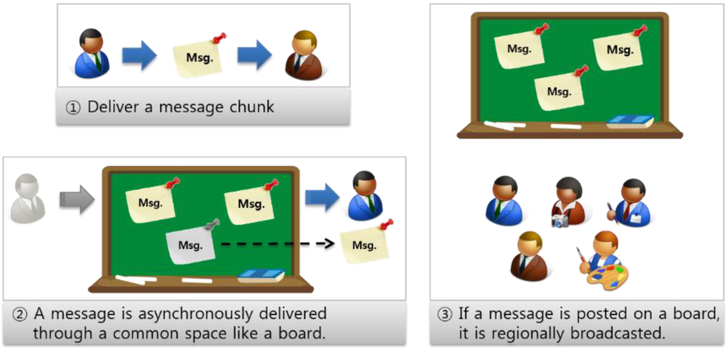 - Message-oriented platformTo asynchronously transfer a large number of small data messages, message-oriented middleware (MOM) is a suitable messaging platform, since it is designed to rapidly convey large numbers of messages [17]. MOM’s publish/subscribe structure has a specialized feature for data sharing between devices. In addition, MOM creates a weak coupling between the mobile nodes and service applications by communicating asynchronously, thereby removing the communication dependency. Thus, it is possible to perform highly reliable communication in an unstable environment, even if traffic congestion occurs.