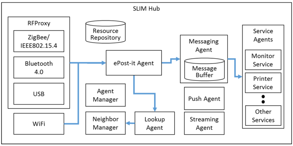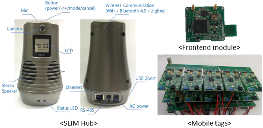 Figure 12 shows the hardware used to evaluate the proposed platform. The SLIM Hub acts as a gateway and provides the location-based services (LBS). It includes speakers, LCD, and ethernet access, and is connected to adjacent SHs using TCP/IP. The frontend module is a protocol gateway connected to an SH to abstract the communication with mobile nodes, such as BLE and ZigBee. The mobile tag is a type of mobile node. The tags are used to evaluate the abstraction and management of a connection-based protocol. Finally, to verify the ePost-it middleware performance, a mobile node connected by TCP/IP is simulated on a PC.