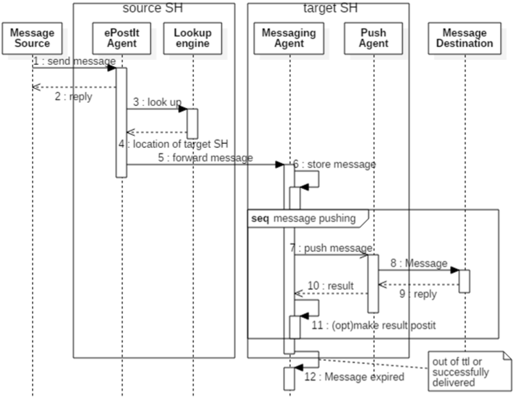 Figure 10 describes the process of delivering ePost-its. A message generated in the mobile node is transmitted to the ePost-it agent of the source SH (1, 2). Then, the ePost-it agent obtains the target SH information using a lookup engine (3, 4), and transmits the message to the messaging agent in the target-SH managing destination (5). The message stored in the message buffer (6) is transferred through the push agent (7–10). Finally, the ePost-it message is removed, as the message was successfully delivered or its TTL expired.