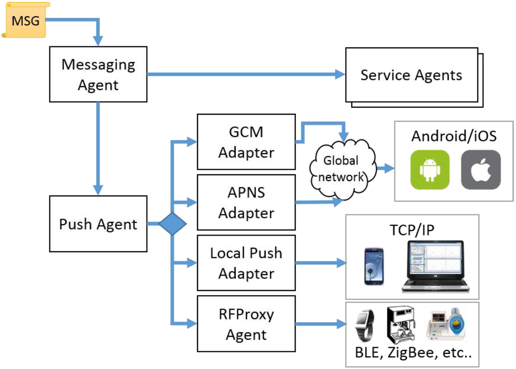 ePost-it middleware use four types of push methods to deliver a message to a mobile node using various communication protocols. Figure 11 illustrates the process of transmitting an ePost-it to mobile nodes of various kinds. The messaging agent forwards the message to the destinations, depending on the destination type. A message targeted to a service agent is transmitted directly. A message targeted to a mobile node is passed to a push agent, and the push agent transfers the message according to the mobile node’s communication type. A global pushing system, such as Google Cloud Messaging (GCM) or Apple Push Notification Service (APNS), transfers the message to a mobile node outside of the SoSp infrastructure. A local pushing protocol transfers it to a mobile node inside the SoSp infrastructure. RFProxy is used for small embedded devices.