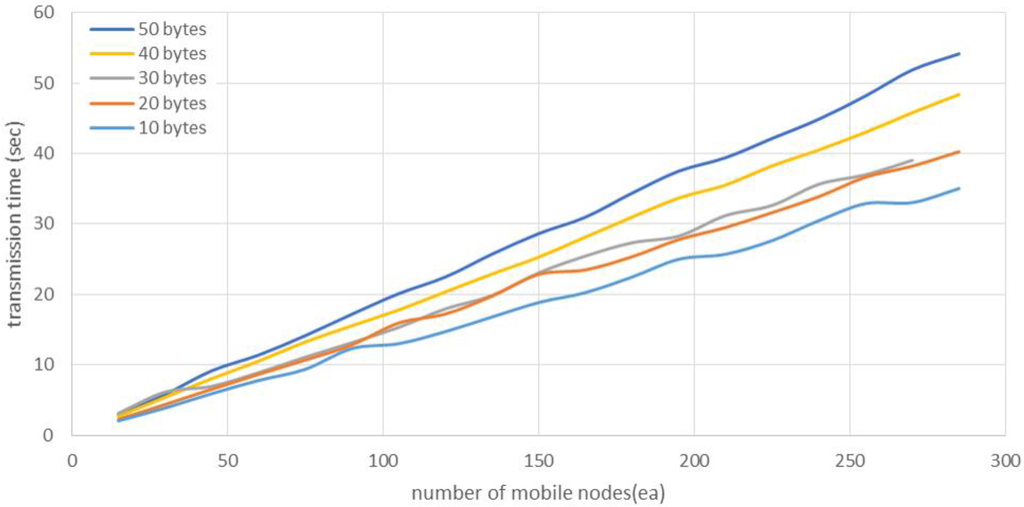 Total transmission time according to the number of mobile nodes.