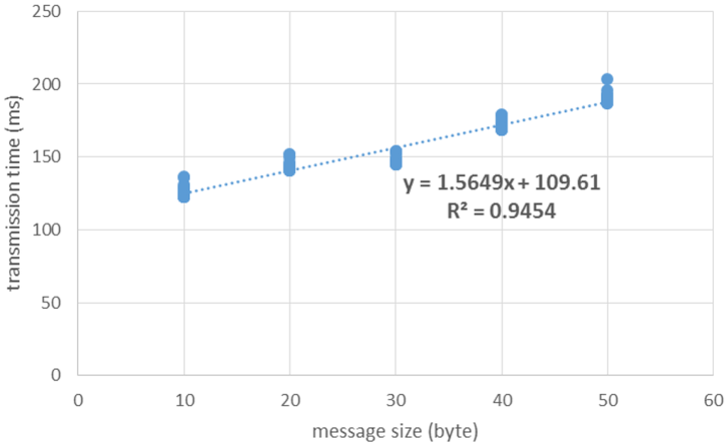 To estimate the performance with more devices, we measure the time used for messaging during a connection. Figure 14 shows the transmission time for sending a message to the FE according to the message size. The transmission time is composed of the connection time and the data-transmission time, as described in Equation (1). By regression analysis of Figure 14 (95% confidence interval), we determined the constants as and .