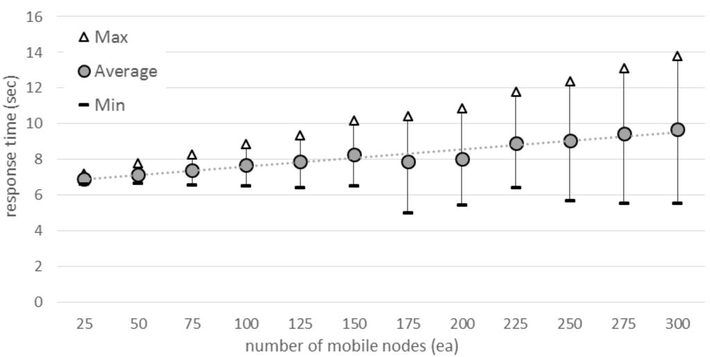 We created a simple service scenario to verify the performance of the ePost-it. In a conference with a large number of users participating, a presenter wants to distribute the presentation materials to the people in attendance. SHs are installed in each presentation room, and an SH sends the file to the mobile devices by detecting the presence of a user. Figure 15 shows the response time from user’s entrance to receiving the message, according to the number of mobile nodes. As shown in the figure, the response time increases slowly as the number of mobile nodes increases. We determined that an SH responds within a few seconds, in spite of numerous mobile nodes.