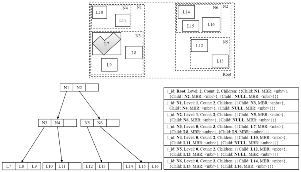 On one hand, R-tree nodes, either leaf nodes or inner nodes, are of nested structures, and R-tree pointers from parents to children are actually addresses, each indicating a unique disk location. On the other hand, MongoDB documents encoded in BSON format support a powerful mechanism to model objects with complex structures, and each MongoDB document is assigned with a unique identifier, i.e., “_id”. This motivates us to simulate R-trees with MongoDB collections and, therefore, enables MongoDB to manage planar spatial data. To be specific, an R-tree structure is presented as a MongoDB collection, where nodes are expressed as documents and pointers are substituted by document identifiers. With such a simulation, an R-tree of hierarchical structure is flattened into a MongoDB collection of tabular presentation. Consequently, a pointer-based node navigation in a hierarchical R-tree is transformed into an identifier-based document tracking in the corresponding collection and, therefore, an R-tree path directed by pointers can be represented as a string of documents linked by identifiers. Figure 1 illustrates an example of R-tree flattened with MongoDB collection, where the bottom left R-tree indexes 10 spatial objects (i.e., L7-L16) depicted in the top and the bottom right collection is the flattened result.