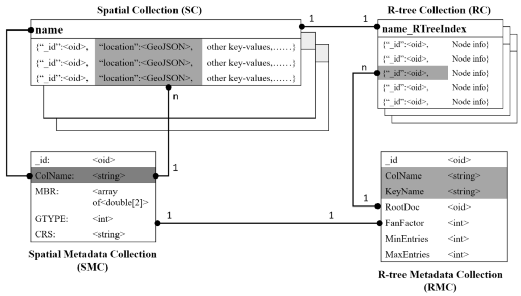 With SMC, users could tell how many planar spatial datasets, each corresponding to a SC, are managed in the system, and further acquire metadata for a registered dataset, such as its geometry type, bounding box, coordinate system, and so on. Since RMC contains a foreign key named “ColName” referencing SMC, users could track whether a spatial collection is R-tree indexed or not by a join operator. Hence, R-tree metadata, like target key (on which the R-tree is built), root document and branching factor, is also available to users. Note that in SMC: key “MBR” is a multi-dimensional bounding box, not just limited to a 2D space, key “GTYPE” should be one of the seven native geometry types supported by GeoJSON, and key “CRS” takes a valid spatial reference system identifier under the EPSG (European Petroleum Survey Group) framework.