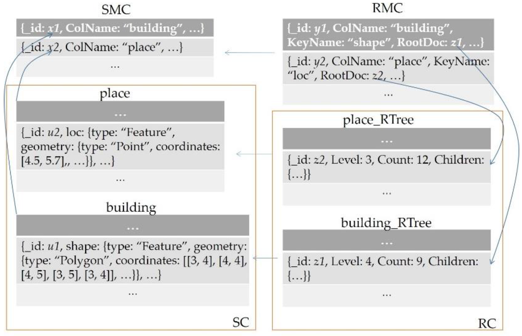 In order to illustrate the R-tree-related storage schema, a user case about spatial data in a city is presented in Figure 3. One can see that two spatial datasets have been loaded into the database as two collections (“place” and “building”) in the namespace of SC and registered in SMC as two documents (x1 and x2). In addition, R-trees for the two datasets have been created in the namespace of RC, namely “place_Rtree” and “building_RTree”, and their metadata have been saved in RMC, namely y1 and y2. With this user case, one could easily derive from SMC that there are two spatial datasets available in the database. Further, it could be confirmed from RMC that each of them is accompanied by an R-tree.