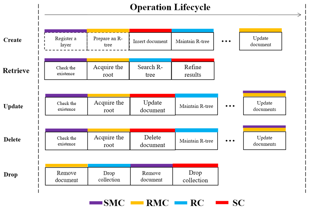 CRUD operations, including create, read, update and delete, are the basic functions that a database or a persistence layer should support. In Figure 6, the execution logic with the flattened R-tree for CRUD operations, as well as for the drop operation, is presented. Note that each operation is carried out by a series of commands, either an R-tree command or a native command.