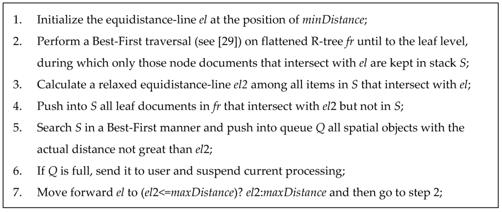 Near queries, compared with range queries, are much more complicated to be handled. As far as static spatial objects are concerned, the most powerful method for k-nearest neighbor searching, to the best of our knowledge, is the incremental nearest neighbor algorithm []. Note that flattened R-trees reside in MongoDB which issues near queries with the following command: {$near: {$geometry: {type: “Point”, coordinates: [<longitude>, <latitude>]}, $maxDistance: <distance>, $minDistance: <distance>}}. Obviously, near queries supported by MongoDB try to look for sorted spatial objects with the distance to the queried point falling into [minDistance, maxDistance]. By putting a distance constraint and testing it during searching, the incremental algorithm could adapt to the MongoDB environment. However, such modification, though straightforward, is inefficient, so that a more efficient variant with cursor support based on the flattened R-tree structure is developed, the pseudo-code of which is presented in Figure 7.
