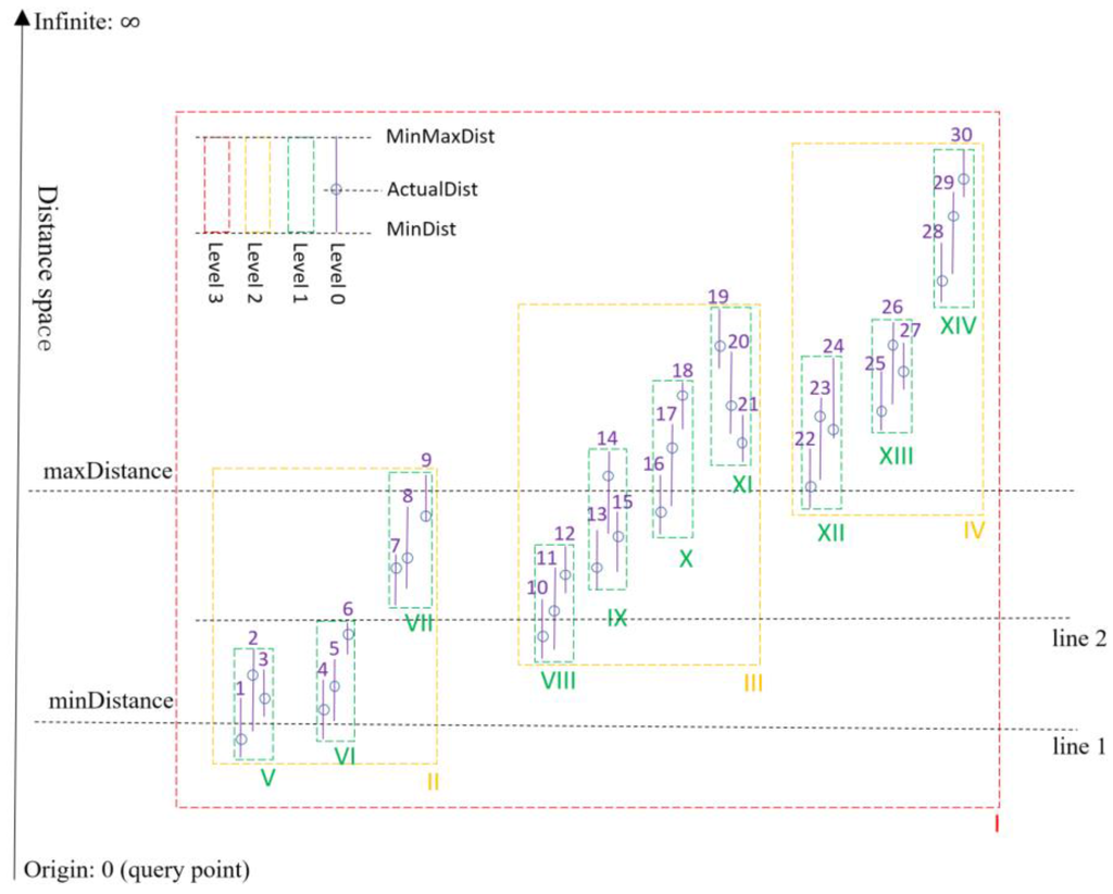 Figure 8 depicts the distribution graph of an example R-tree in the distance space with respect to a query point, which will be explored to illustrate how to handle a near query with the above algorithm. For the first round of scanning (assuming el is at line 1), nodes V and VI are determined in step 2, el2 located at line 2 is derived in step 3, and node VIII is joined into S in step 4. After that, the three involved leaf nodes will be expanded in a best-first manner [], and consequently, objects 4, 3, 5, 2, 10, and 6 will be pushed into Q gradually. The last step is to move forward the equidistance line to line 2, from which a next round of scanning could be performed. The main idea behind the algorithm of Figure 6 is to move forward the equidistance line from minDistance to maxDistance, during which related nodes and entries are progressively scanned and processed. Compared with the straightforward modification, our variant reads and checks as few node documents as possible to return the result in batches and, therefore, achieves to answer MongoDB near queries in a more efficient way.