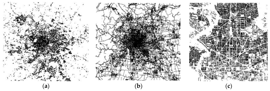 Thumbnail images of three experimental datasets. (a) Paris POI; (b) Beijing streets; and (c) DC buildings.