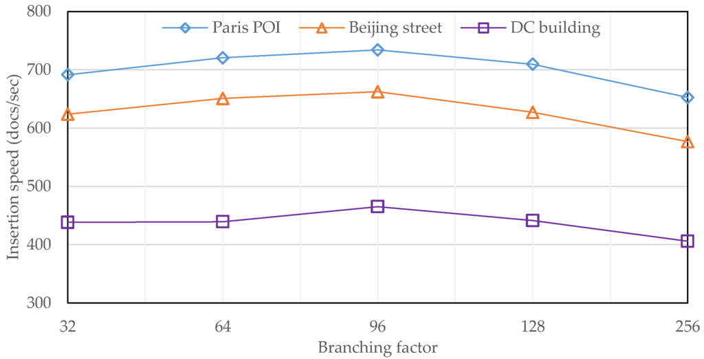 From the vertical point of view, the insertion speed of the third dataset is significantly slower than that of the other two datasets, because the third dataset has a higher density on object distribution and, therefore, it is more likely to trigger node overflow during R-tree construction. In addition, the first dataset achieves a highest insertion speed due to its geometry type of point.