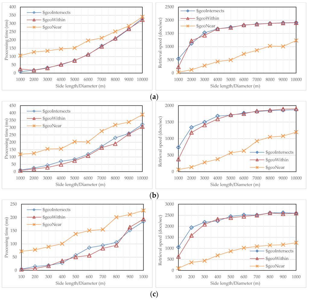 During each test, the flattened R-tree with a branching factor of 96 was selected to accelerate query processing. The results are presented in Figure 11, in which every dataset is measured from two perspectives, one processing time and the other retrieval speed. From the viewpoint of predicates, $geoWithin and $geoIntersects perform very similarly over the three datasets on not only processing time but also document throughput. As the query window enlarges, the response time increases dramatically, while the throughput initially increases, then tends to stabilize. For example, the retrieval speed of the third dataset starts at about 1000 docs/s, then keeps increasing, but finally stabilizes at about 2500 docs/s. By comparison, it is less efficient for $near to be processed with the flattened R-tree, but the gap continuously shrinks as the query window enlarges. The reason is that $near performs searching as well as ranking: with a small query window, ranking accounts for a high share of the runtime; while inputting a large query window, searching, due to involving a substantial amount of I/O, dominates the runtime. In addition, the document throughput of $near keeps increasing, though the growth tends to be narrowed.