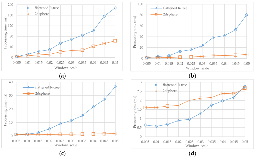 In addition, this experiment was repeated on the lake dataset of Wuhan, China that contains 4260 polygon objects, and the results are presented in Figure 12d. With the increasing window size, our flattened R-tree initially outperforms the built-in 2dsphere but eventually catches up. The reason is that the objects in this dataset are complex in shape and vary in range (from thousands of square meters to tens of square kilometers) and, therefore, geometry calculation, particularly for 2dsphere, contributes a lot to the processing time when the query window is small or moderate, while data fetching starts to dominate the runtime when the query window becomes large.