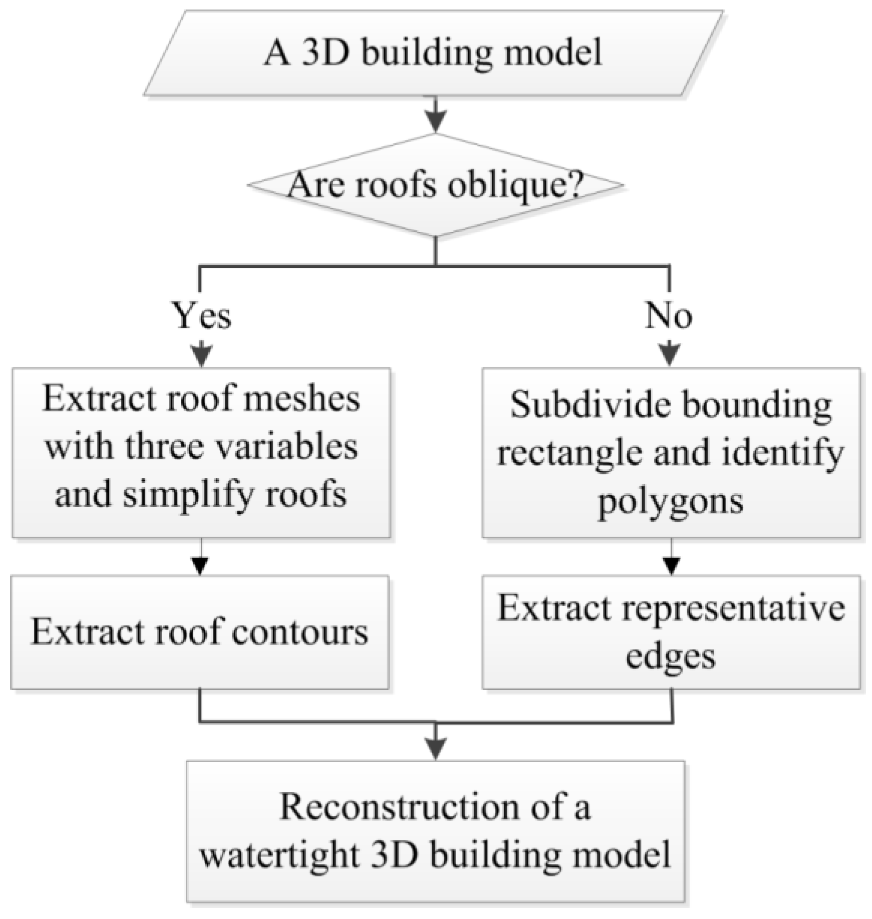 Figure 1 shows the flowchart of the proposed approach. The first step detects the roof type of a 3D building. Based on the result of the first step, the proposed approach chooses a corresponding branch for simplifying a 3D building. For a 3D building with sloped roofs, the simplification process will focus on developing roof contours. For a 3D building with flat roofs, the simplification process will leverage topological attributes to develop representative edges. In the subsections below, the details of each step will be elaborated.