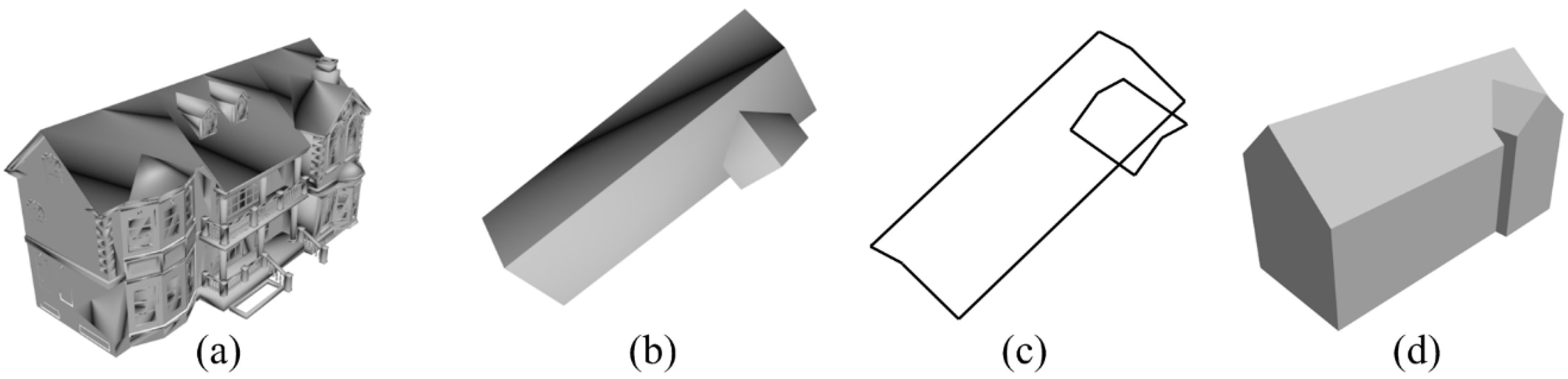 Simplification procedure of a 3D building with four sloped roofs: (a) the original 3D building; (b) the simplified roofs; (c) the extracted roof contours; and (d) the reconstructed watertight 3D building.