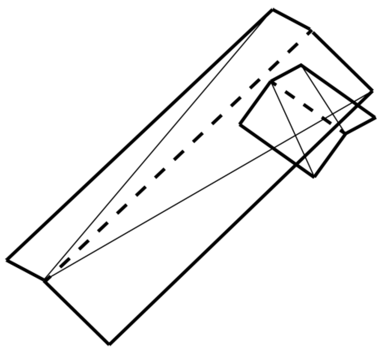 Roof contours refer to specific roof edges used to construct wall meshes. The reason to extract roof contours from final roof meshes instead of using all roof edges to construct wall meshes is to save data volume. In addition, regular roof edges do not influence the overall appearance of the reconstructed 3D building. The method adopted here looks for edges that fit two removal criteria. The first criterion takes advantage of the exact nature of these edges, i.e., each edge in the roof contours is close to a wall or even shared with a wall, and therefore at least one of the two endpoints forming such an edge must be the lowest vertex of the roof mesh containing such an edge because walls are under roofs. In this way, the “ridge” of the roof (shown in dashed lines in Figure 3) could be removed. The second criterion identifies the longest edge of a mesh edge (shown in thin lines in Figure 3). As any such edge is shared by two roof meshes, it is definitely not the roof contours and has to be removed. Note that Figure 2b and Figure 3 display the same data in different modes. Figure 3 is the wireframe mode while Figure 2b is the mesh mode.