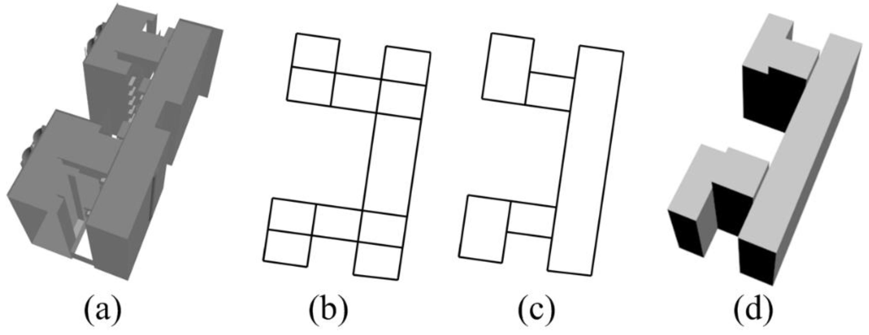 Other methods focus on dealing with local or global structures during simplification of 3D buildings. With regard to methods emphasizing local structures which indicate local characteristics of 3D buildings, Jiang, et al. [29] proposed a feature preservation method based on cell clustering and surface reconstruction which involves three steps. First, 3D buildings are voxelized into cells. Second, boundary cells are extracted and a cell binary tree is constructed. Finally, the simplified 3D buildings are reconstructed based on a modified dual contouring algorithm. Similarly, Sun, et al. [30] presented a structure-preserving algorithm, which also voxelizes 3D buildings into cells. Points are then sampled at the surface of cells. At the second step, the sampled points are classified for the convex decomposition of 3D buildings. At the third step, the simplified 3D buildings are obtained by combining the convexes. Even though these two approaches preserve features and structures of 3D buildings, it remains challenging to identify various structures. To tackle this challenge, Li, et al. [31] proposed a structural simplification method, which uses convex/concave analysis to extract three types of structures: embedded structures, compositional structures, and connecting structures. Specific rules are made for simplification of geometric structures, and 3D buildings are simplified progressively.