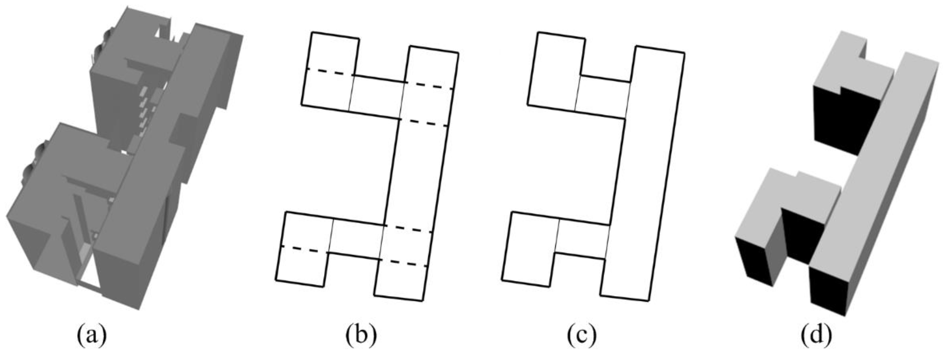 The proposed method simplifies a 3D building with flat roofs based on its walls for two reasons. First, its walls are the global features that serve as the basis for reconstructing the 3D building. Second, the area of walls is needed as input in the process of simplifying the 3D building. The process involves three steps: (1) subdivision of bounding rectangle of the building ground plan based on wall meshes and identification of polygons locating inside the 3D building; (2) extraction of representative edges from the polygons; and (3) reconstruction of a watertight 3D building. Figure 4a–d shows an example of a 3D building with flat roofs and the result of each step.