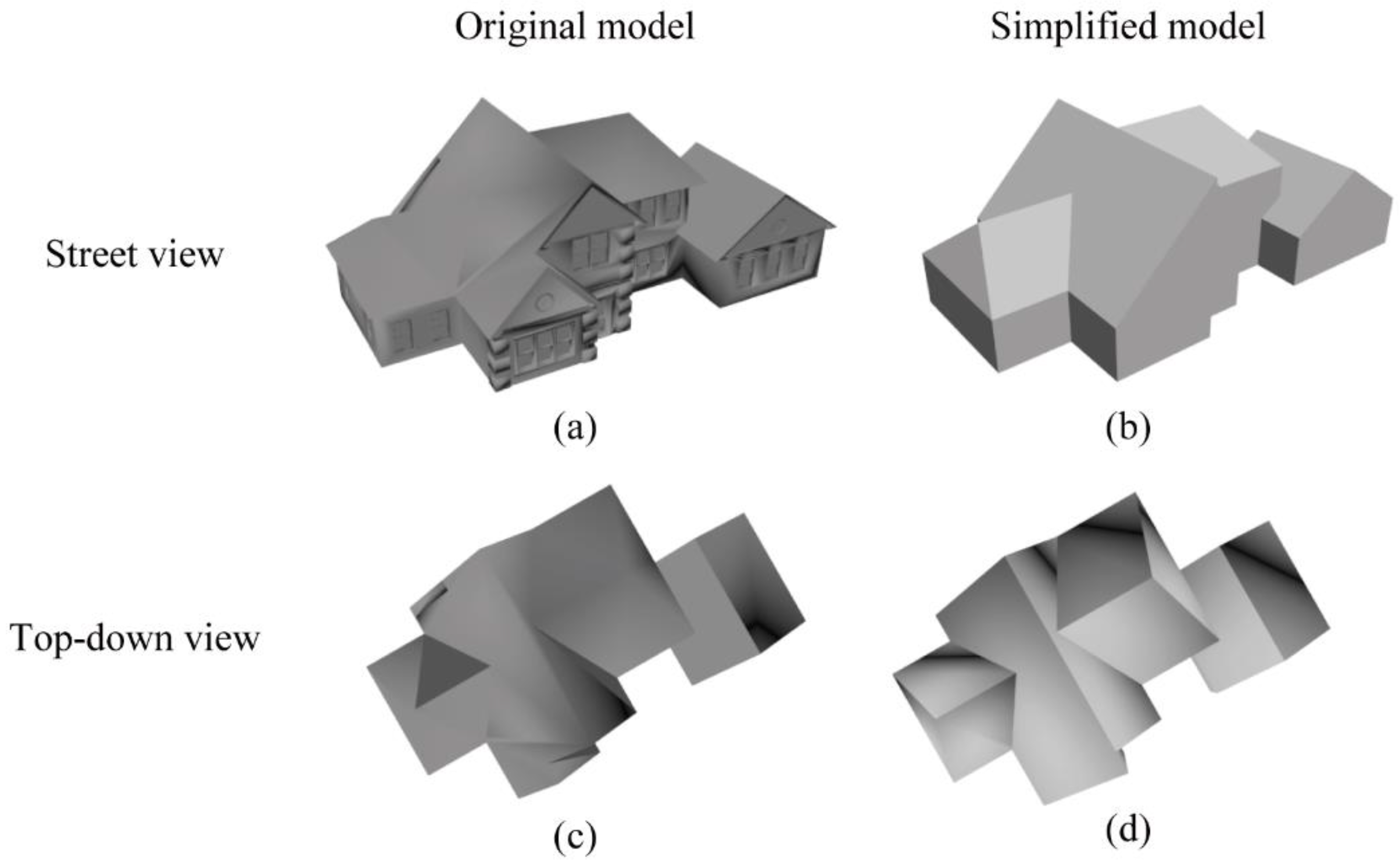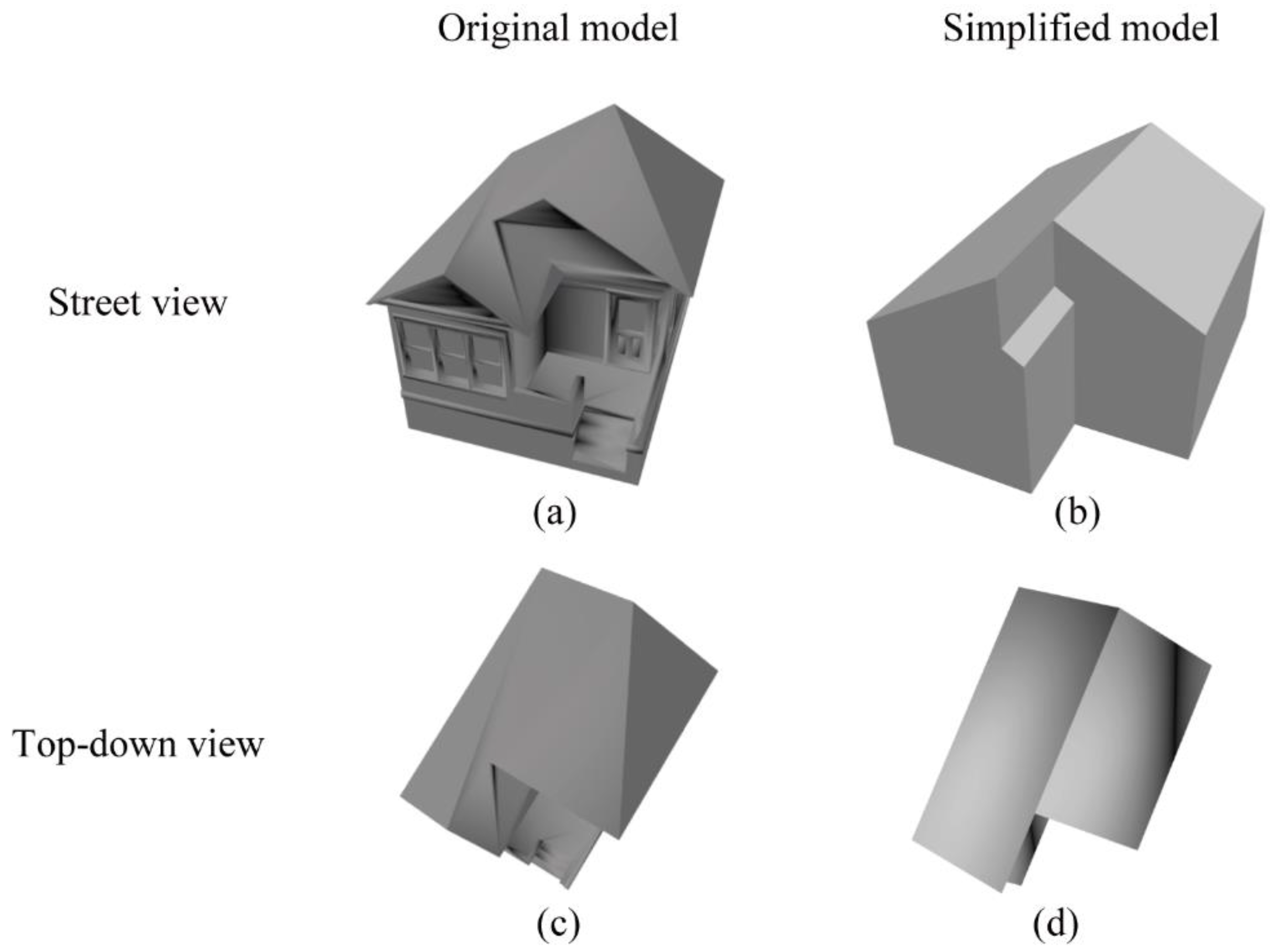 Simplification of a 3D building with sloped roofs: (a) original model in street view; (b) simplified model in street view; (c) original model in top-down view; and (d) simplified model in top-down view.