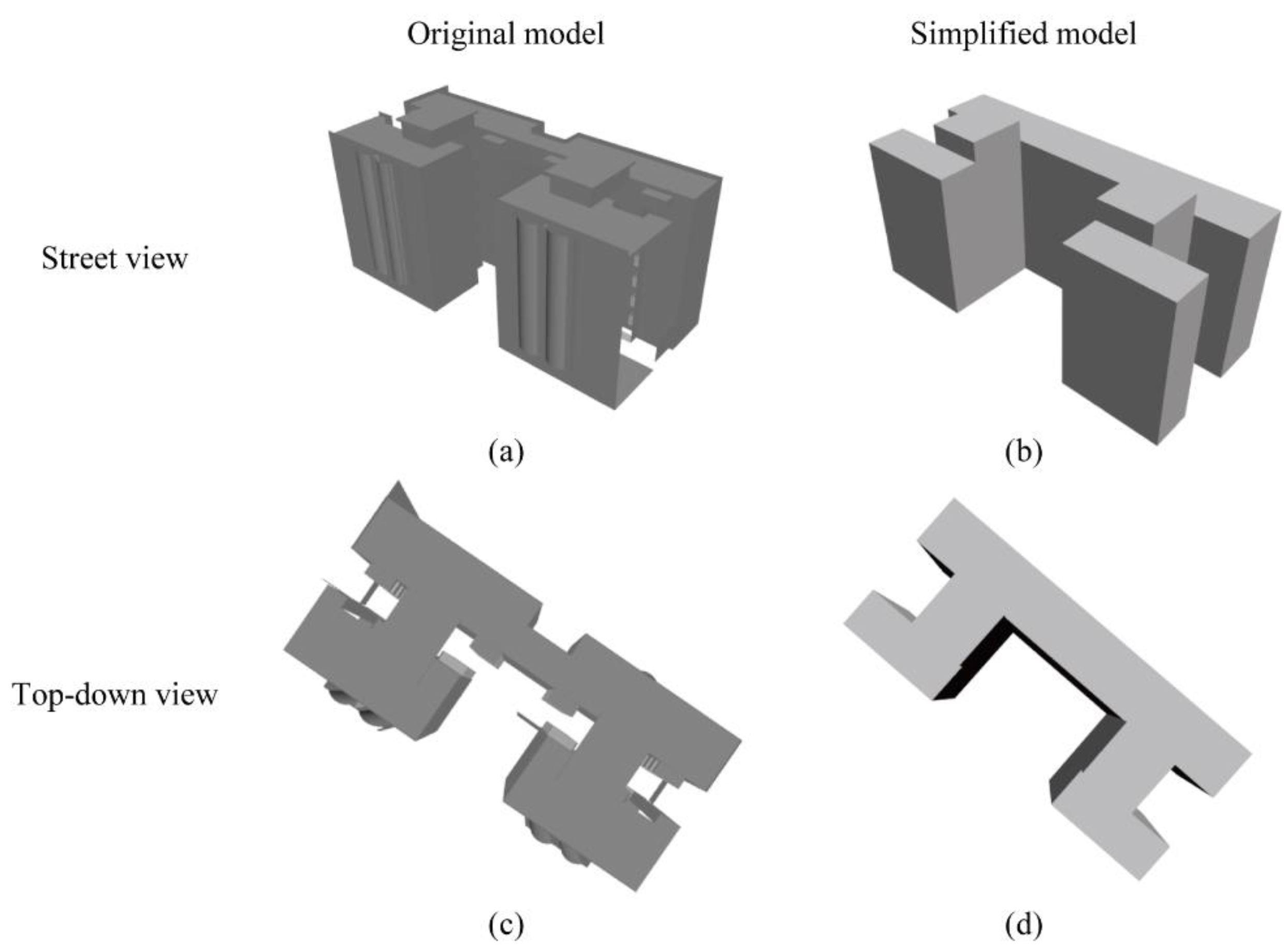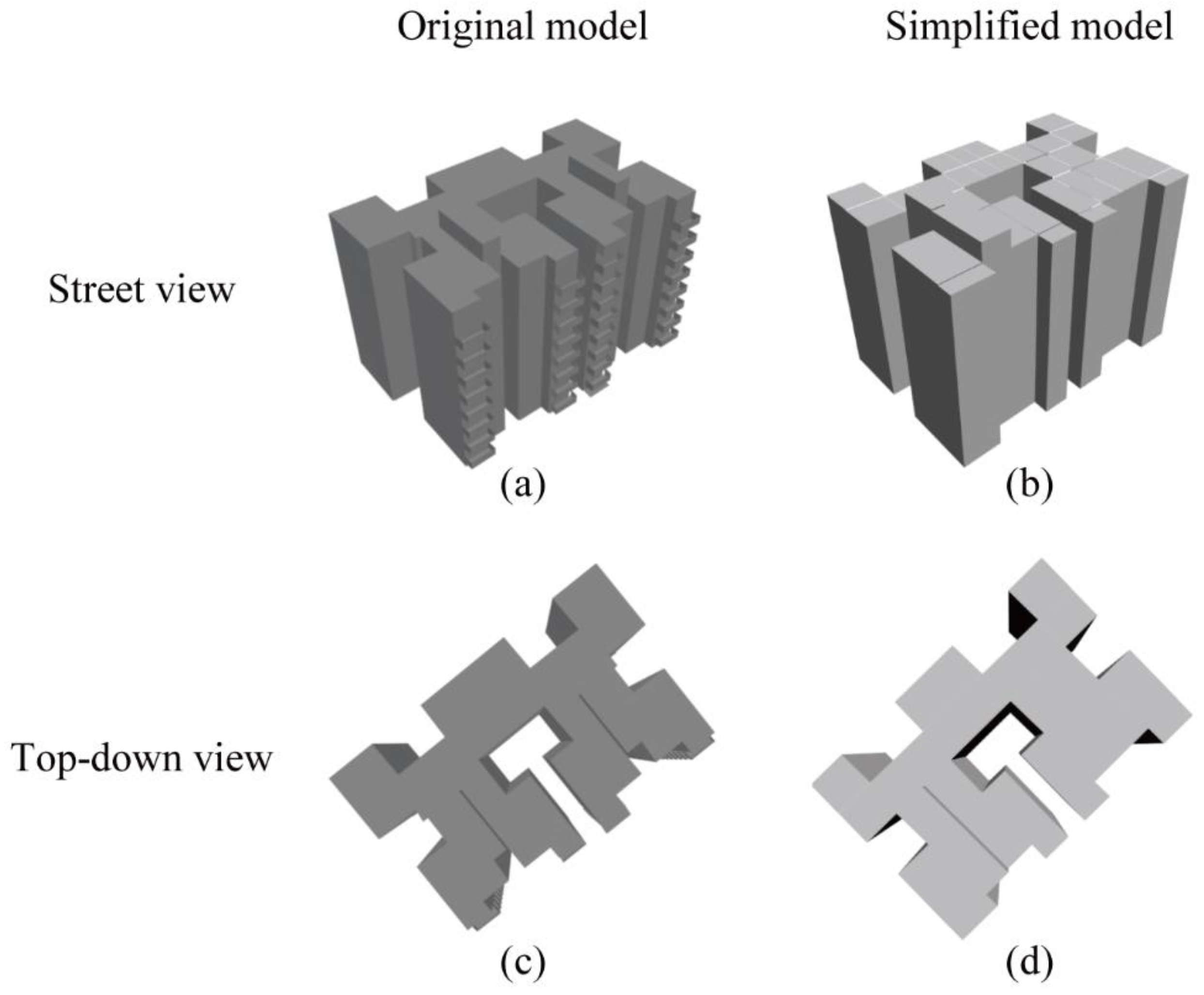 Simplification of a 3D building with flat roofs: (a) original model in street view; (b) simplified model in street view; (c) original model in top-down view; and (d) simplified model in top-down view.