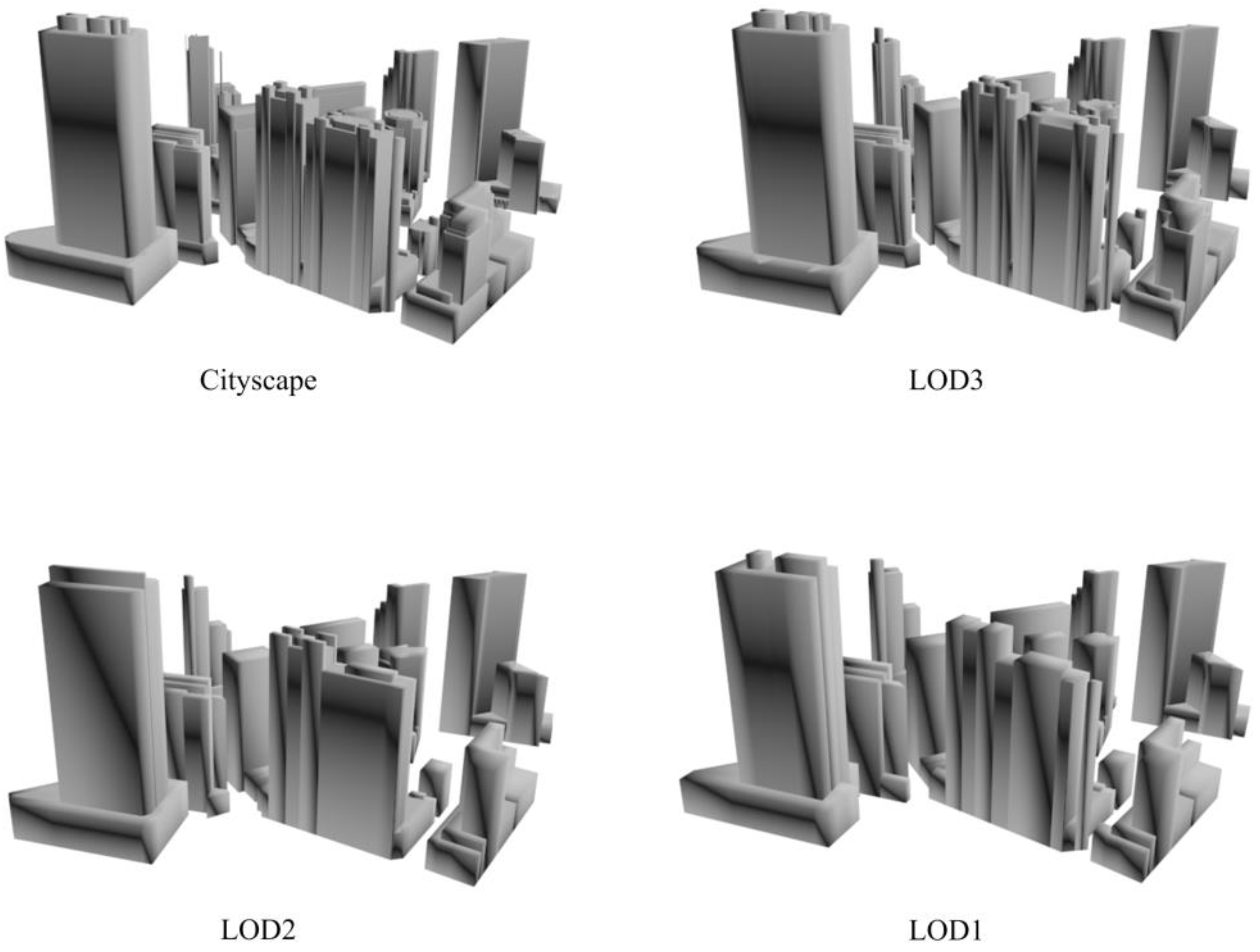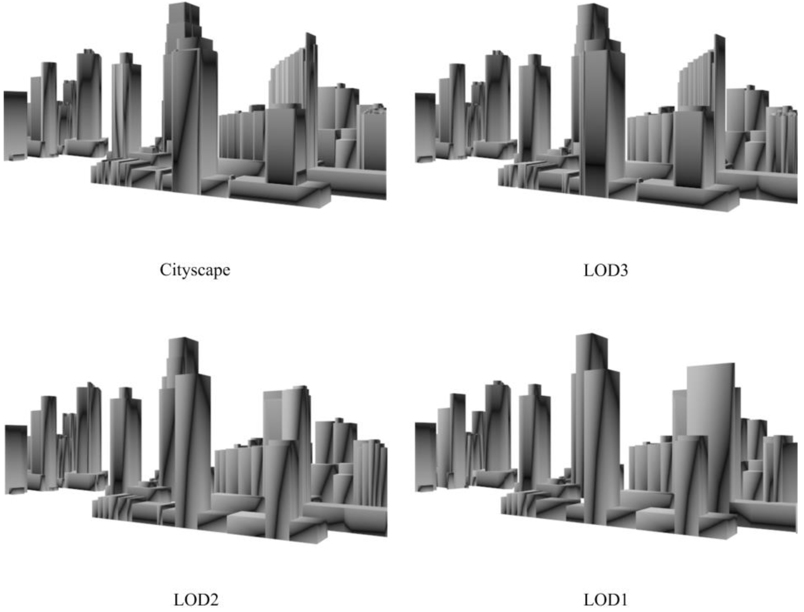 To tackle this challenge, existing studies have resorted to multi-scale representations [8,9,10,11]. In these studies, important buildings such as landmarks, buildings in the focus areas where users are interested in, or buildings which are near to the view point are visualized with 3D buildings in high levels of details (LODs) [12] while others are visualized in low LODs. Compared to representation of all 3D buildings in high LODs, the multi-scale visualization demands less data volume, which in turn improves the efficiency of visualization. Furthermore, its ability to show both 3D buildings in high and low LODs promotes visual contrast and enhances 3D buildings in high LODs, which helps its users catch important information more intuitively.
