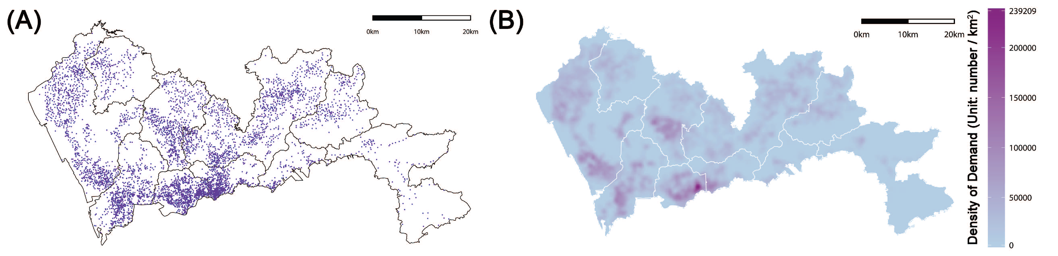 - García-Palomares, J.C.; Gutiérrez, J.; Latorre, M. Optimizing the location of stations in bike-sharing programs: a GIS approach. Appl. Geogr. 2012, 35, 235–246. [Google Scholar] [CrossRef]