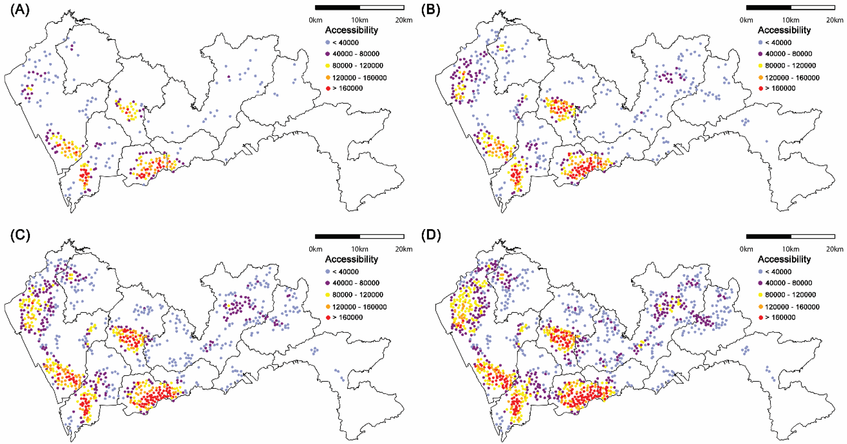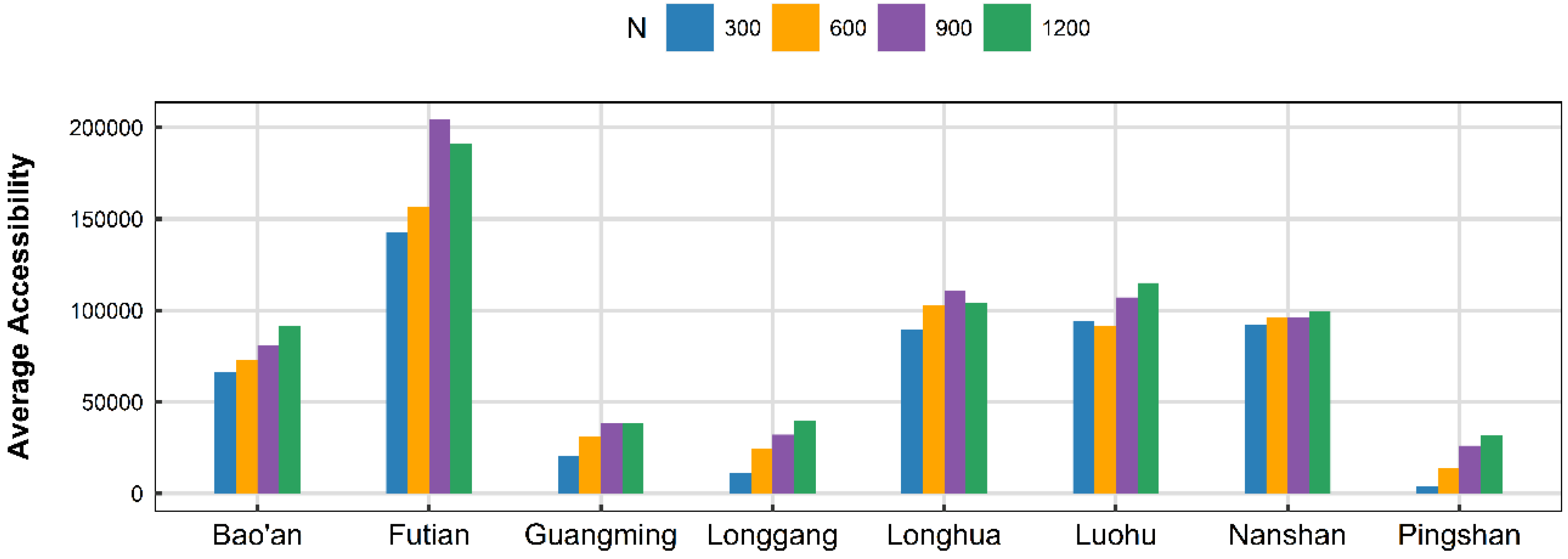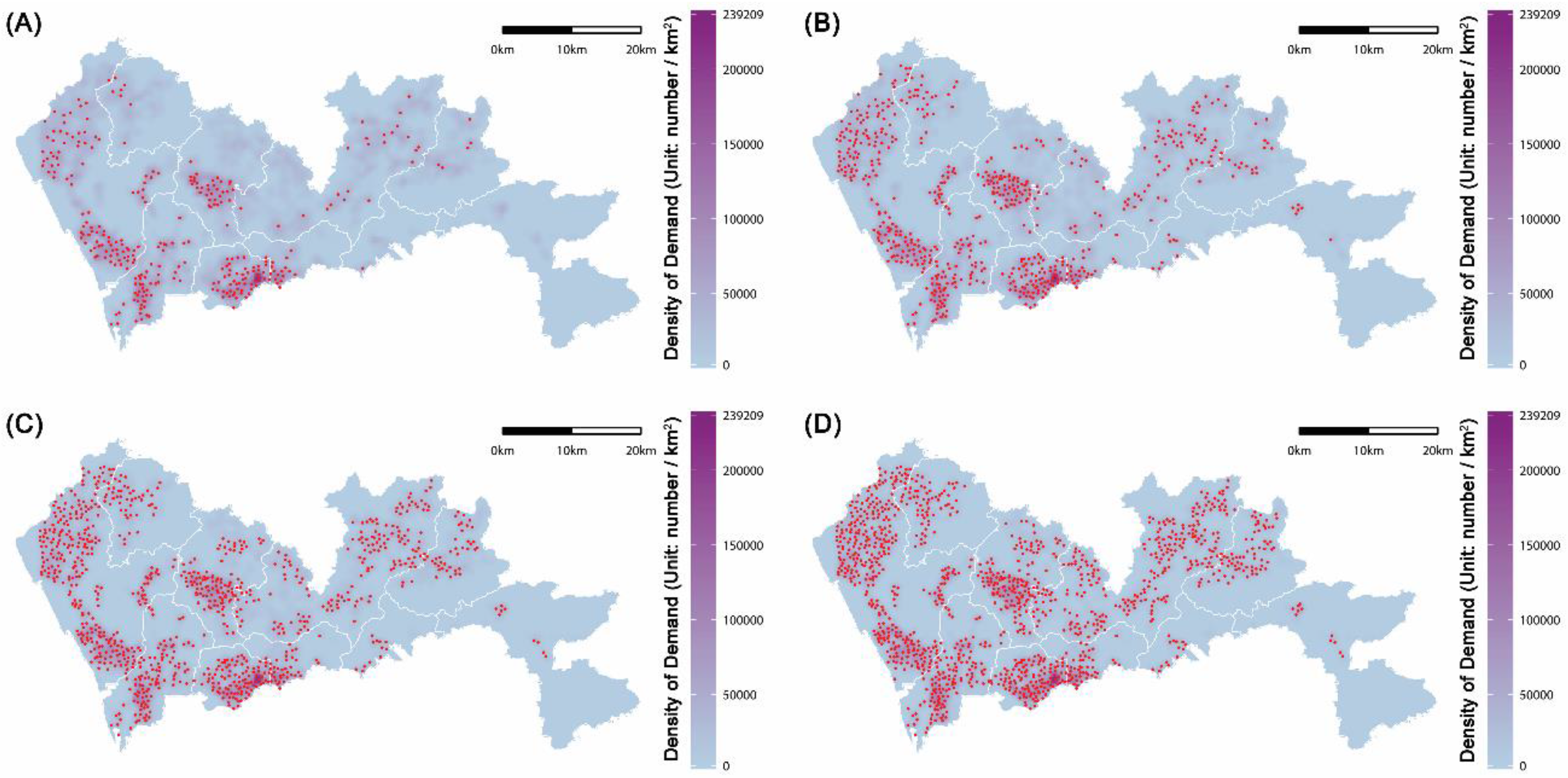 - Based on the total demand (i.e., sum of inflow and outflow) generated at each cellphone tower, a maximum coverage location-allocation model is used to suggest locations of bike sharing stations under four different scenarios (e.g., 300, 600, 900, and 1200 bike stations). Two measures are introduced to further understand the characteristics of the suggested bike station locations: (1) accessibility; and (2) dynamic relationships between incoming and outgoing trips. The accessibility measure quantifies how well the stations could serve bicycle users to reach other potential activity destinations. The dynamic relationships between incoming and outgoing trips reflect the asymmetry of human travel patterns at each bike station over time, which serve as useful information for the operation of a bike sharing system (e.g., distribution and redistribution of bicycles among the bike stations).