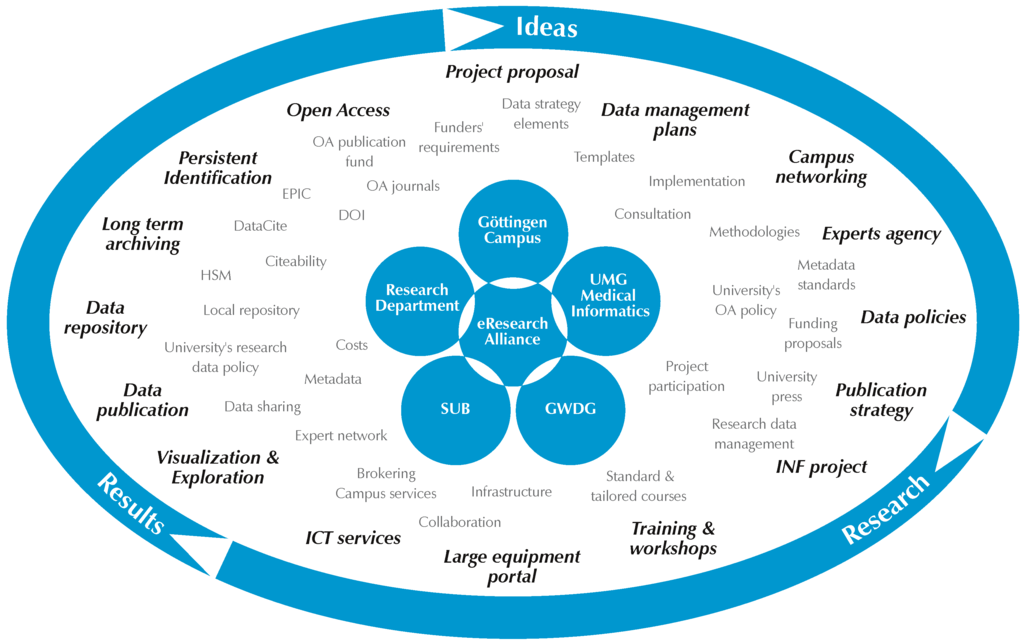 The digital transformation is fundamentally changing the way research is done in all fields. On the one hand, researchers are processing and studying more digital data in all research fields, on the other hand, research is increasingly conducted in a networked fashion. The Internet, email, videoconferencing, social media, e-journals, Virtual Research Environments, etc., make it possible to work in large, international, and interdisciplinary teams. The digital transformation of academic research culture poses many challenges concerning the management, protection, preservation and sustainable provision of research data, and the shared use of resources. These challenges can only be solved if all stakeholders, from the individual researchers, to universities, libraries, computing centers, and third-party funders work together. In this sense, we understand the term e-research as the provision and usage of digital tools and data in a collaborative and distributed mode [1]. In Germany educational policy bodies and third-party funders aim to join efforts by giving recommendations [2,3] and guidelines [4] (pp. 21–22), [5,6] on research data management on the national level. The German Wiki Forschungsdaten.org [7] provides up to date information about national and international developments concerning research data management. Currently seven German universities (Bielefeld University, Göttingen University, Heidelberg University, Humboldt-University Berlin, Kiel University, TU Darmstadt, and University of Wuppertal) have an institutional research data management guideline or policy according to a sub site of the above wiki [8]. Given the complexity of achieving sustainable research data management, a task that requires not only special disciplinary and interdisciplinary RDM skills, but also extra human and financial resources, and based on the insight that additional requirements concerning research data management should be accompanied by institutional support [9] (p. 51), [10] (pp. 67–68), it is no surprise that most German universities that have already issued research data guidelines are also setting up an institutional support infrastructure though the timeline, state of development, and approach may vary with individual circumstances. In this case study, we will have a closer look at the situation at Göttingen, where the Georg-August-Universität Göttingen (Göttingen University) has officially set up the Göttingen eResearch Alliance [11] (eRA) as a support infrastructure parallel to the issuing of its research data guidelines [12]. In the following, the Göttingen eResearch Alliance—including its service offerings in addition to those supporting research data management as such—will be introduced in general terms. In the remaining sections, the focus will be mainly on its service elements concerning research data management support to faculty, followed by a discussion and prognosis for the further development of the campus infrastructure.