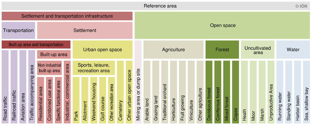 - Krüger, T. Aktuelle Ergebniss des IÖR-Monitors zur Flächennutzung in Deutschland. In Flächennutzungsmonitoring III—Erhebung, Analyse, Bewertung; Meinel, G., Schumacher, U., Eds.; Rhombos: Berlin, Germany, 2011; pp. 23–35. [Google Scholar]