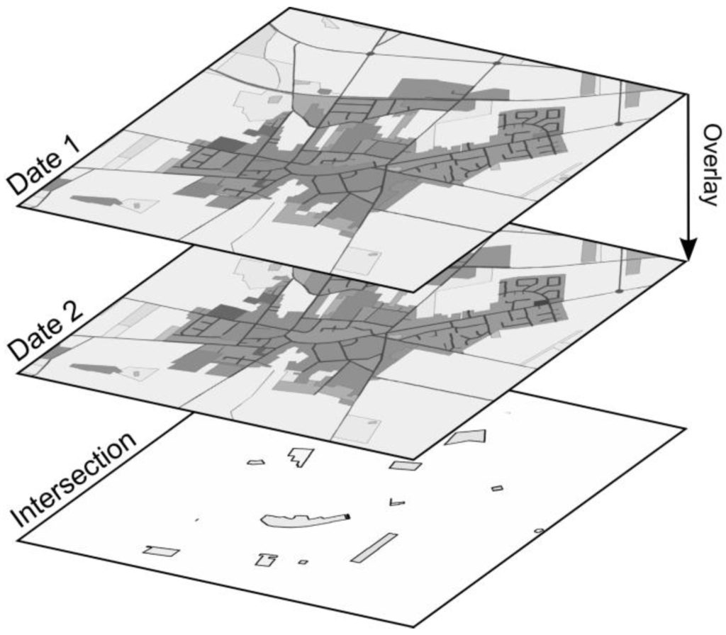 The identification of land use changes between two separately prepared time slices Date 1 and Date 2 is based on the principle of a spatial intersection of the two datasets (Figure 3). The objects of the resulting intersection carry the attributes of both input datasets. Therefore, land use change for distinct areas can be identified for the overlapping areas of the Date 1 and Date 2 data.