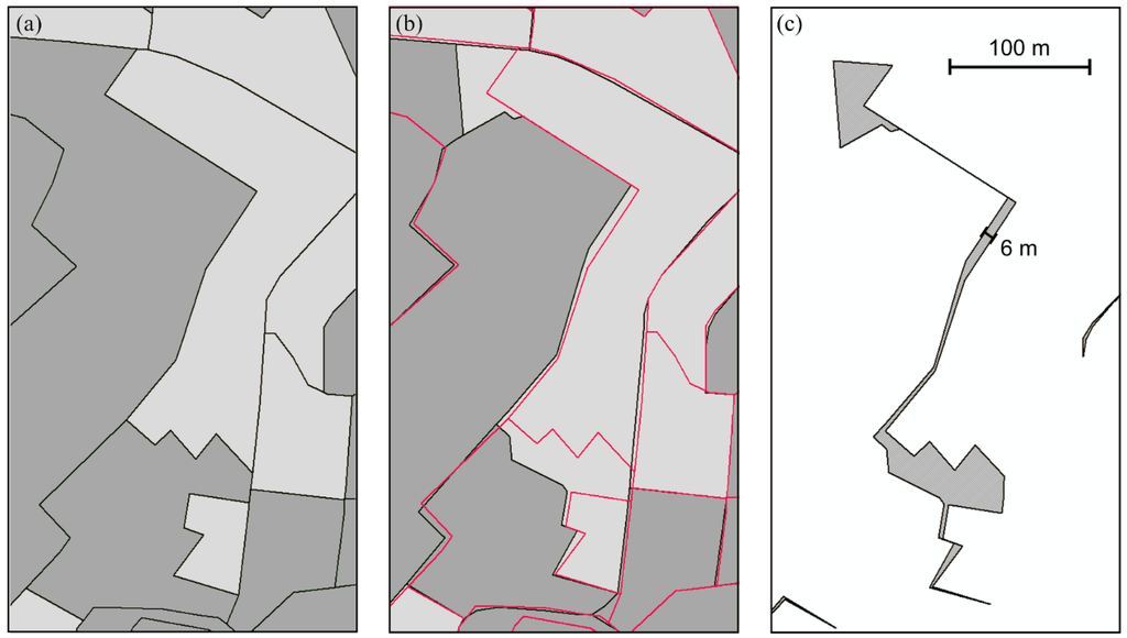 Small shifts of a common edge of adjacent polygon objects cause sliver polygons when intersecting two subsequent datasets. Thus, even if the real-world situation is unchanged, a land use change would be detected. Figure 5 shows the effect of minor corrections of edge vertices on the change detection resulting in undesired sliver polygon patches in addition to real changes, which show up as bigger polygons. Mostly, real changes and sliver polygons occur in combination (Figure 5c).