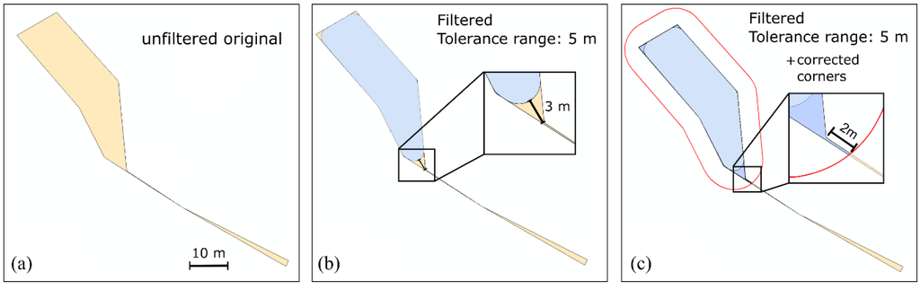 After the first processing step (i.e., dilated opening) the remaining objects that have not been removed are slightly larger than their originals. The second processing step (i.e., intersection with the original feature) can cause small spikes occurring at the polygon corners (Figure 9c). Since B1 is defined by the position accuracy (or the allowable edge shifting tolerance, respectively), it has to be kept constant for all objects, regardless of their size. The dimension of the remaining spikes after the intersection with the original features is limited by the size of B2, which can be adapted in relation to the filtered object size in order to minimize the appendices’ dimensions. However, due to the tiny total effect on the objects’ area, which can be estimated as negligible, B1 and B2 can conveniently be defined as identical.